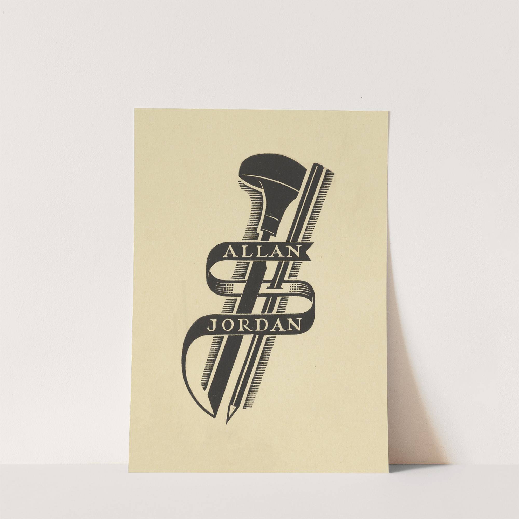 This striking art print features a bold, black silhouette of a musical saxophone, intricately designed with detailed lines and curves to highlight the instrument's sleek contours and keys. The word "ALLAN JORDAN" is prominently displayed in a stylish, flowing script...