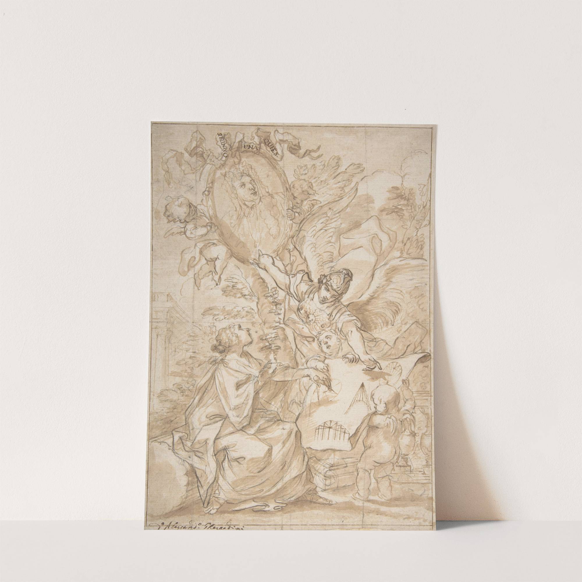 This art print features "Allegorical Homage to an Architect" by Alessandro Gherardini, executed in delicate sepia tones that evoke a sense of classical elegance and timeless beauty. The composition is rich with intricate details and dynamic movement, capturing the artist's...
