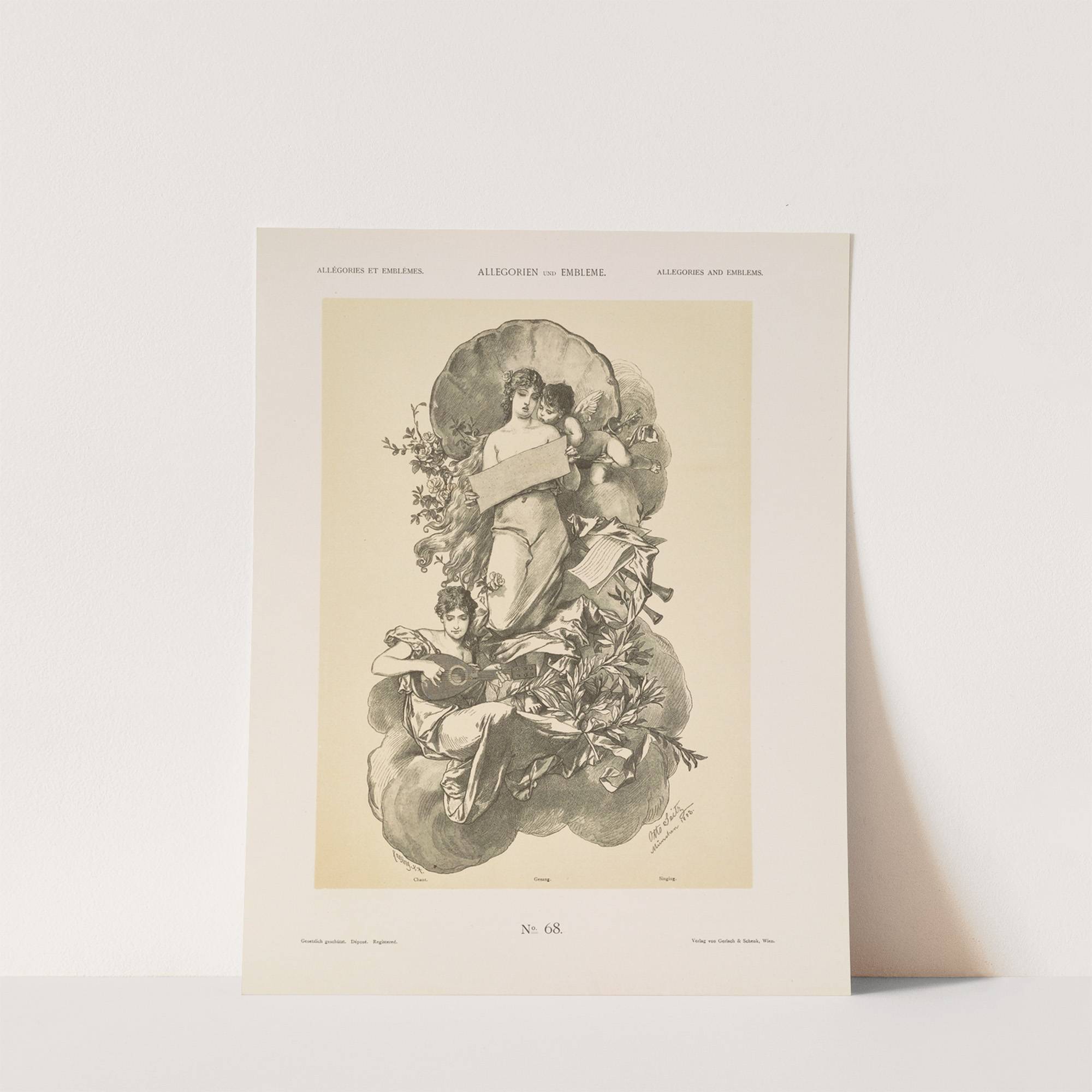 This stunning art print features "Allegorie und Embl?me," Volume I, Plate 078 by artist Albert Ilg. The illustration showcases two women in an elegant, classical style. One woman sits gracefully at the top of a lush floral arrangement, her figure...