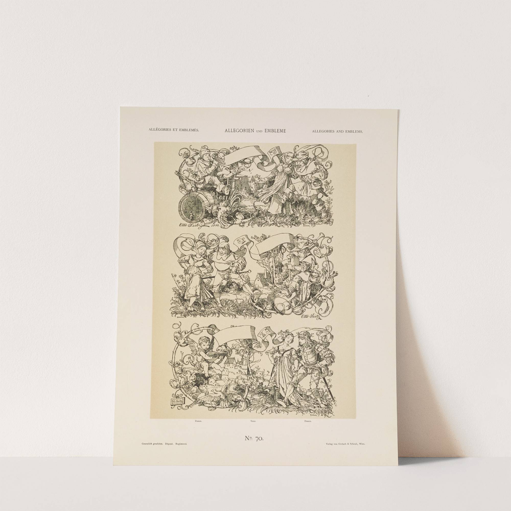 This exquisite art print showcases "Allegorie der Sicheln" or "Coin Allegories" by renowned artist Albert Ilg. This monochromatic, black-and-white illustration features intricate, detailed line work typical of classical engraving styles. The image is divided into three vertically stacked panels, each...