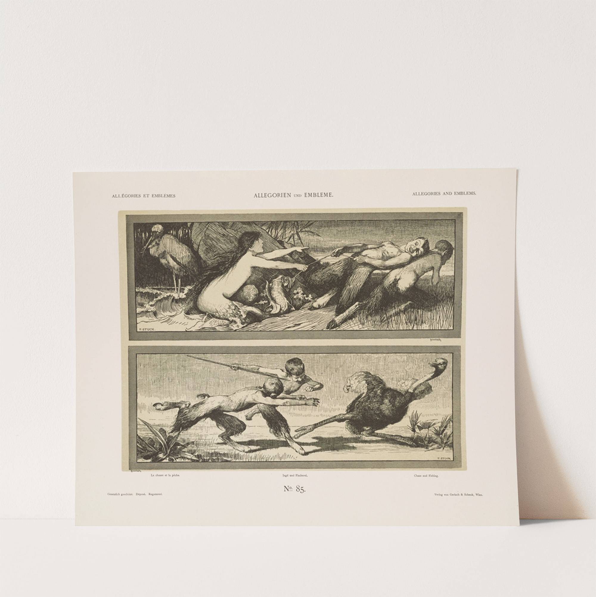 This set of two black and white etchings by artist Albert Ilg features allegorical scenes rich in detail and classical imagery. The top panel depicts a dramatic struggle between several figures; a muscular, nude male with a strong physique engages...