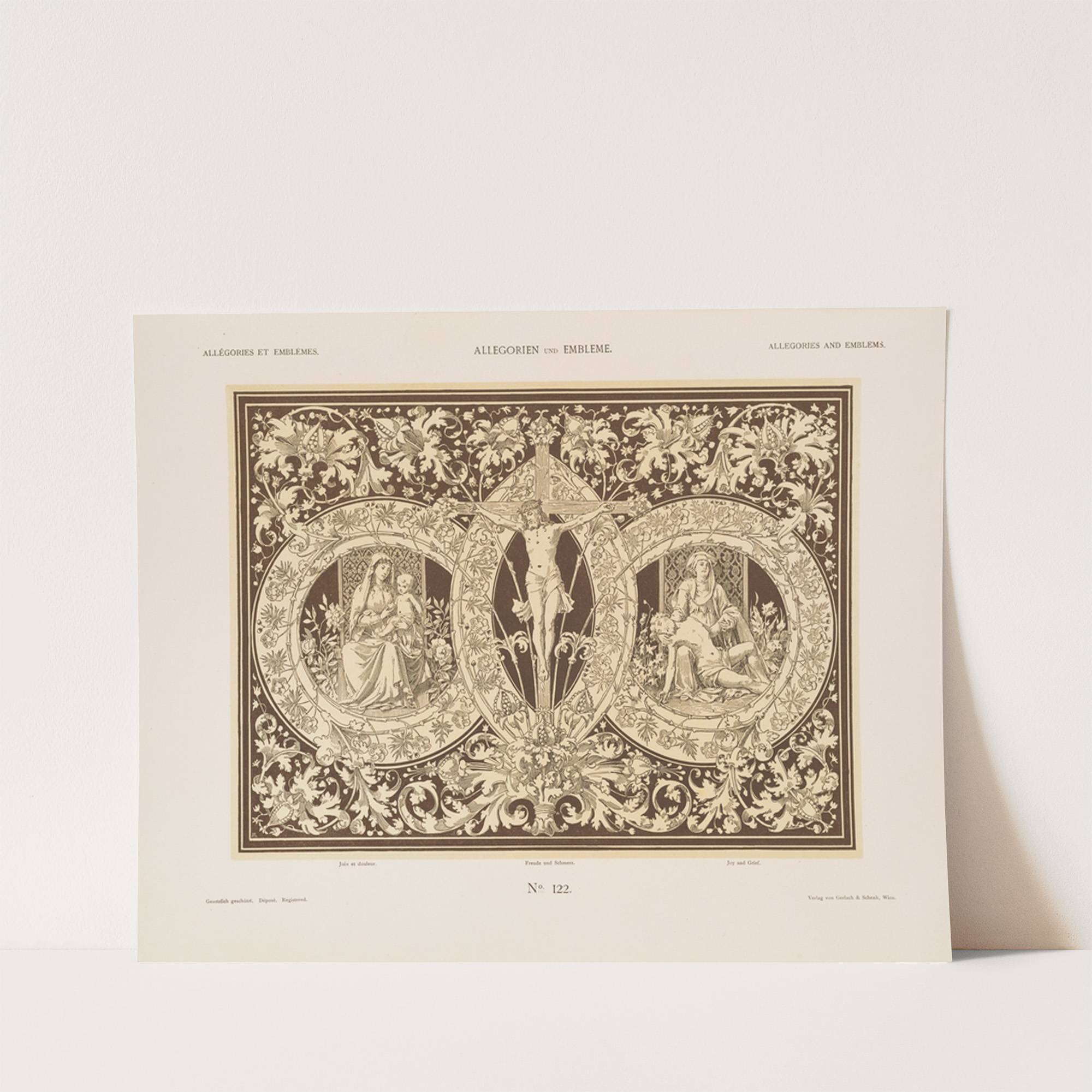This intricate artwork, "Allegorien und Embl?me Vol. I Pl.146" by Albert Ilg, is a masterpiece of detailed etching and engraving. The design features two large intertwined circular motifs that frame central medallion-like compositions. Each circle contains an ethereal figure in...