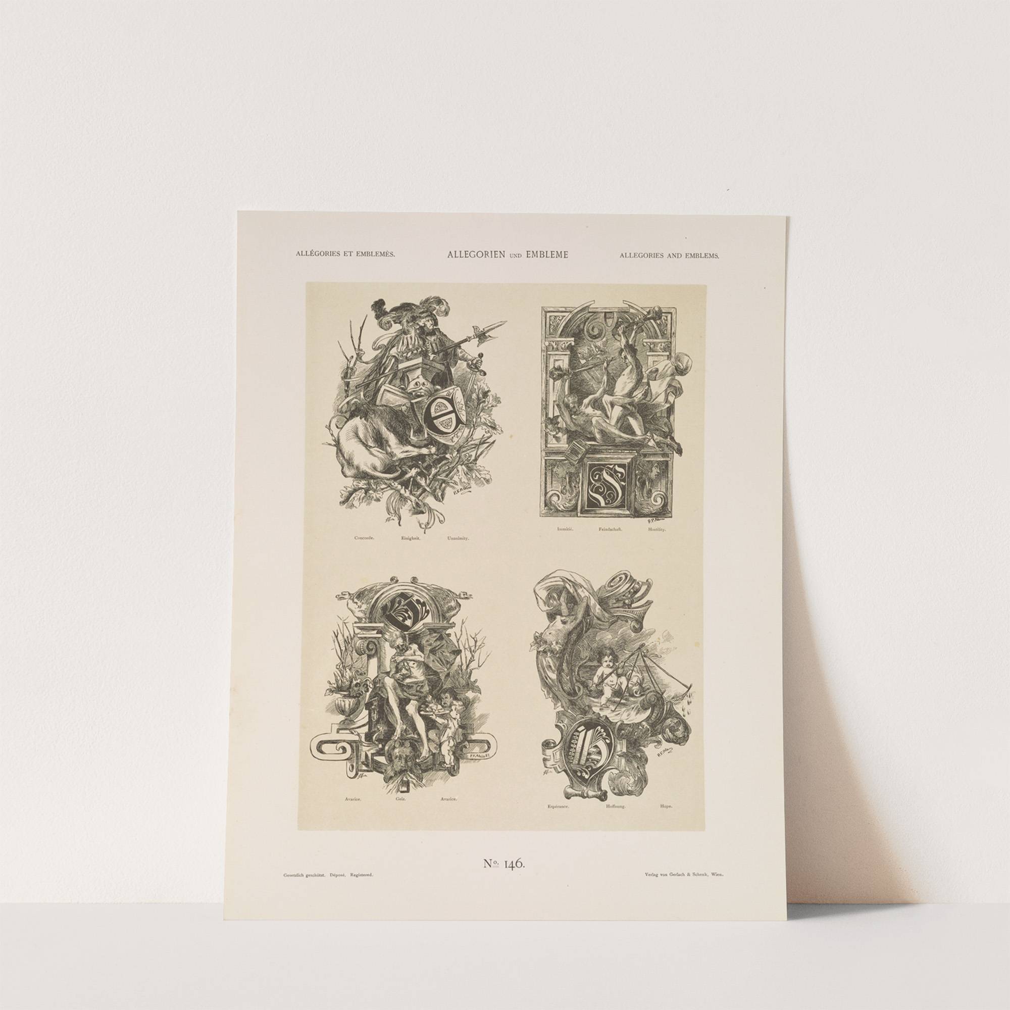 This beautifully detailed art print features four intricately designed illustrations from "Allegorien und Emblème" by artist Albert Ilg. Each illustration is rendered in exquisite black and white with a vintage, illustrative style, capturing elements of mythology and allegory.The top left...