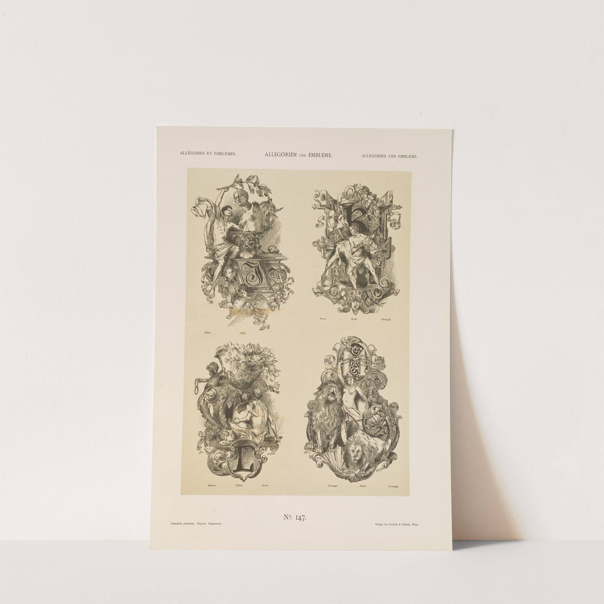 Introducing "Allegories und Embl?mes," a captivating collection of intricately detailed illustrations by the renowned artist Albert Ilg. This set features four beautifully crafted emblems, each bursting with intricate patterns and symbolic elements. The top-left illustration depicts a cherub holding a...