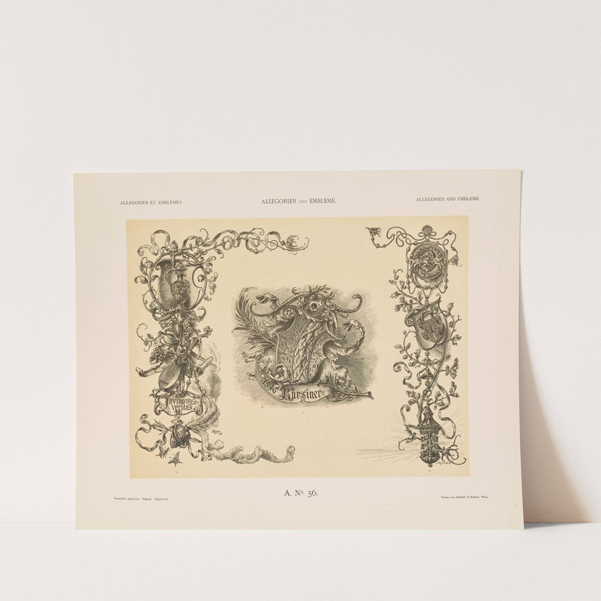 This elegant print showcases a finely detailed monochromatic illustration titled "Allegorie und Emblème Vol. II Pl.064" by artist Albert Ilg. The central focus is a dynamic depiction of a snarling lion, exuding raw power and majesty with intricately rendered fur...