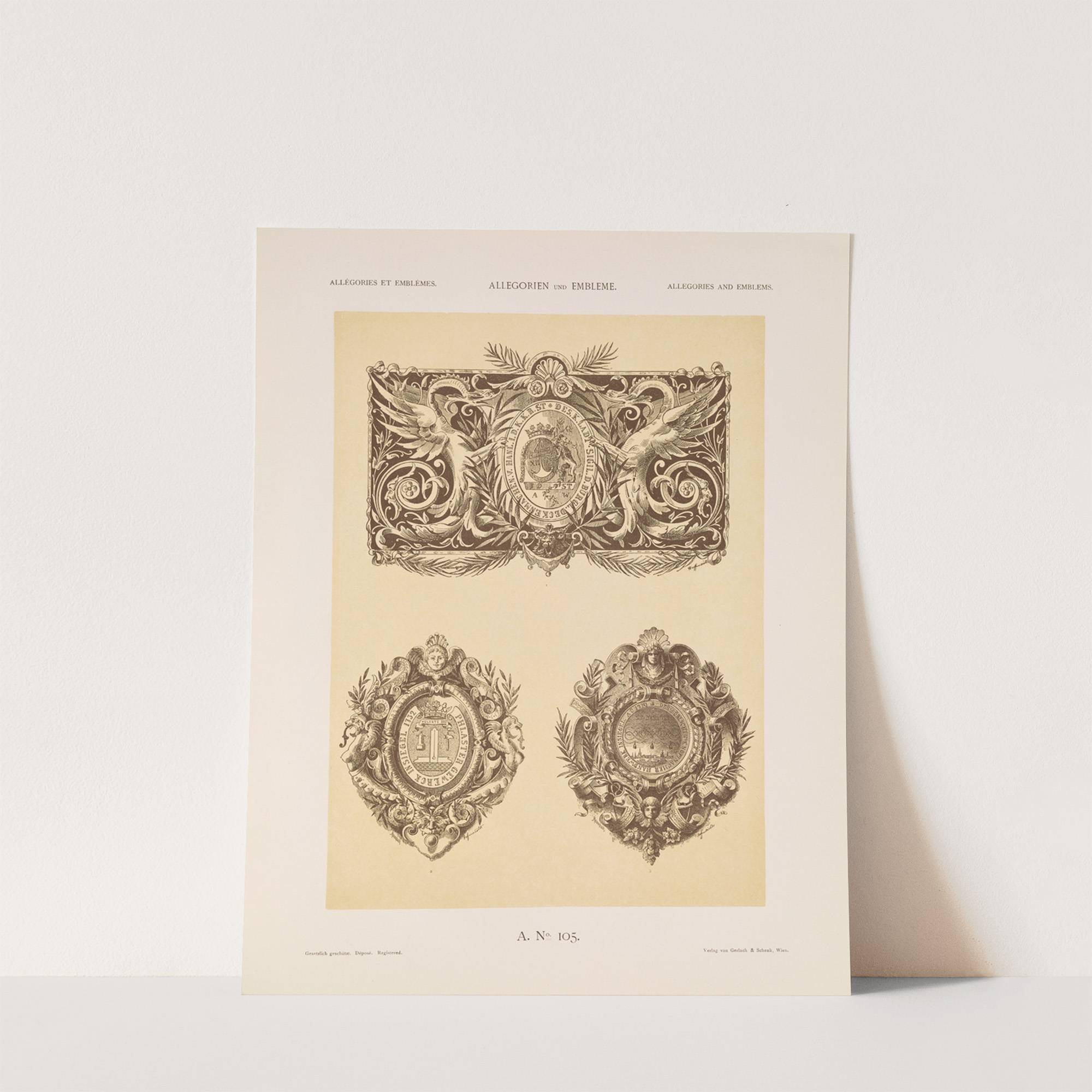 This intricate artwork showcases three elaborate, baroque-style emblems with ornate details and rich textures. The top image features a rectangular emblem adorned with swirling patterns, delicate filigree, and symmetrical wings that frame a central medallion. This medallion is marked by...