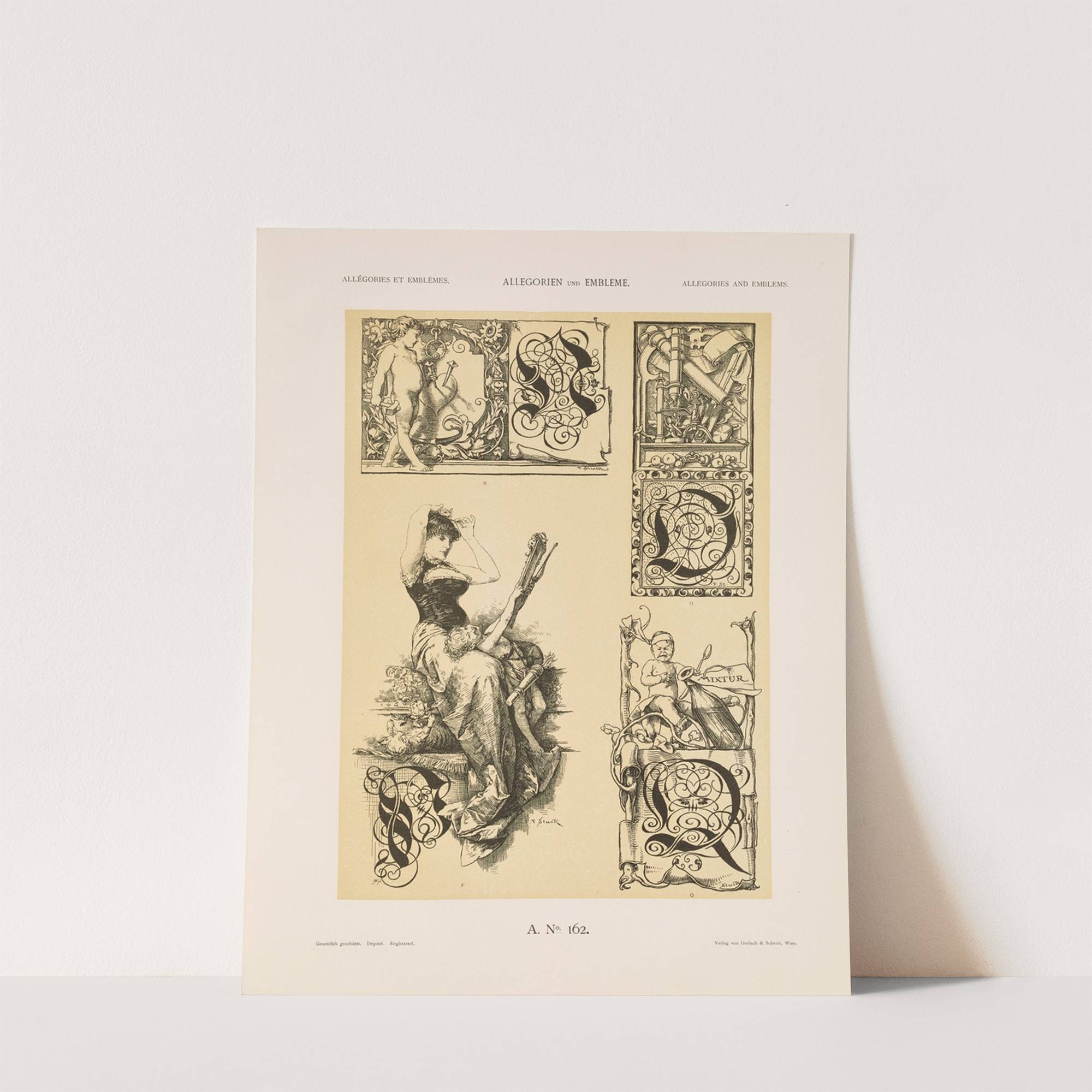 This artwork features intricate black-and-white illustrations from "Allegorie et Emblèmes" by Albert Ilg, Volume II Plate 174. The central focus of the piece is a seated woman holding a staff or lance, adorned in traditional clothing with a detailed, flowing...