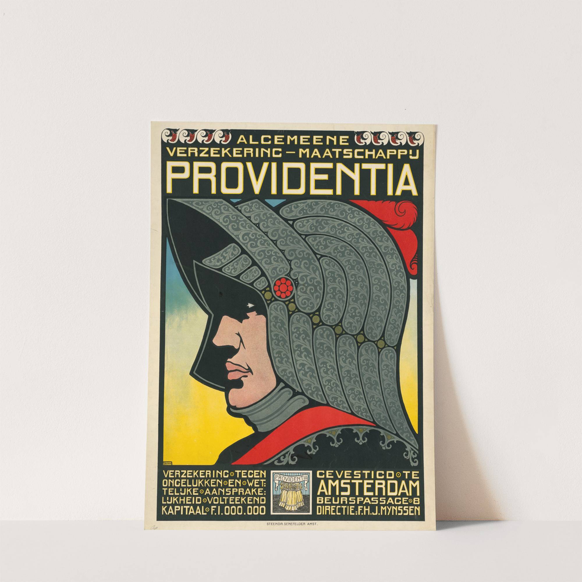 This vibrant art print showcases "Allgemeine Verzekering - Maatschappij Providentia" by Albert Hahn, created in 1910. The artwork features a striking profile of a medieval knight in detailed armor, dominated by a black helmet with intricate patterns and a red...