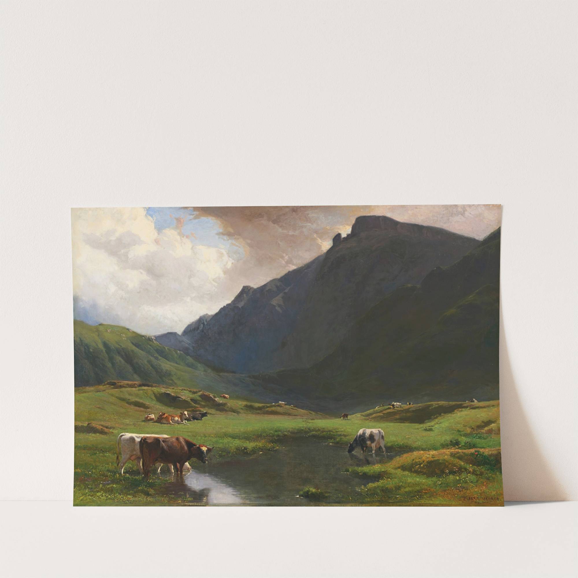 This stunning art print showcases "Alpine Landscape with Cows and Goats" by Albert de Meuron, capturing a picturesque alpine scene in vivid detail. The composition features a serene mountainous landscape bathed in soft light, with rolling green pastures stretching across...