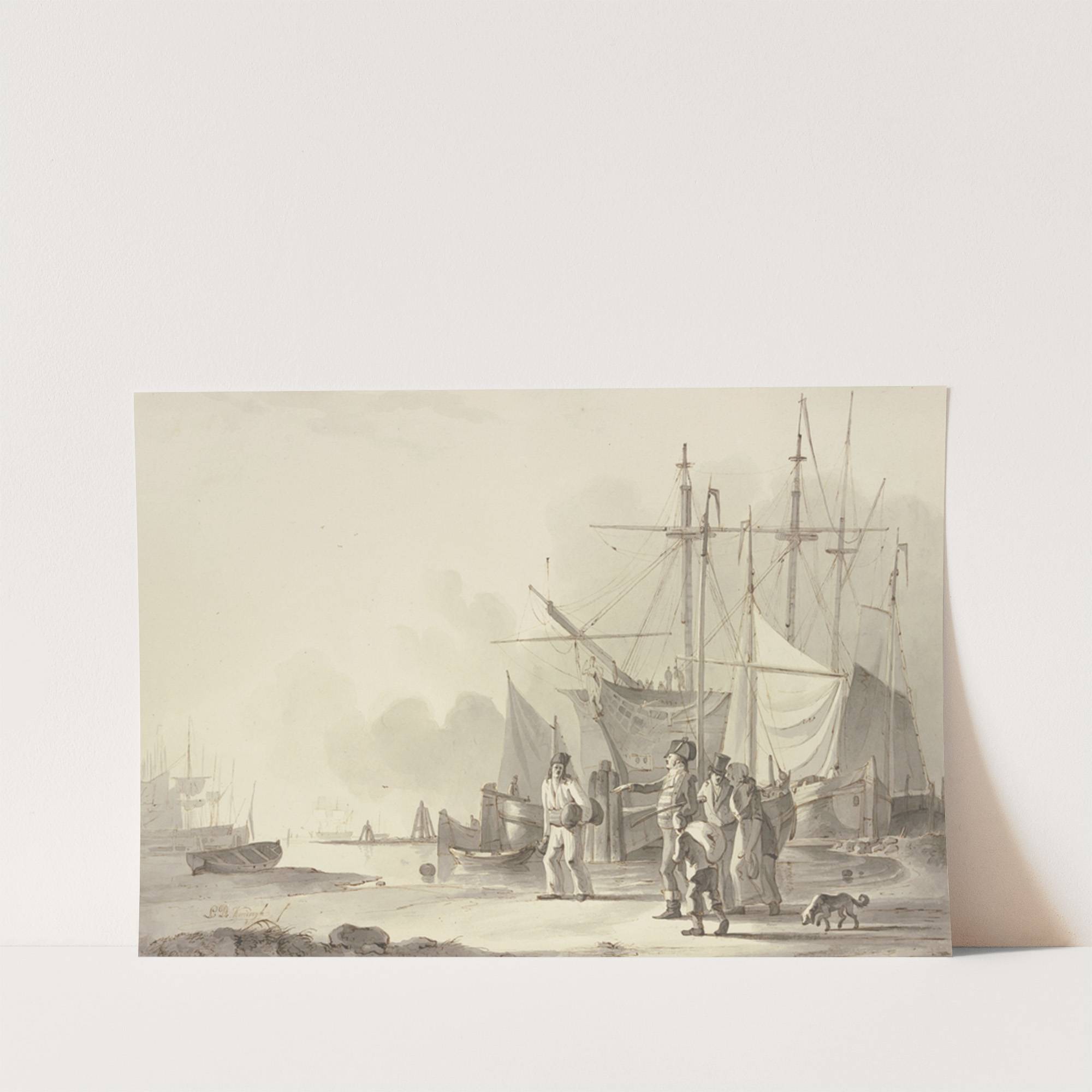 Am Strand liegen viele Schiffe, ein Schiffskapitän in Uniform geht nach links mit mehreren Personen und einem Hund by Leendert de Koningh - Wall Art Print