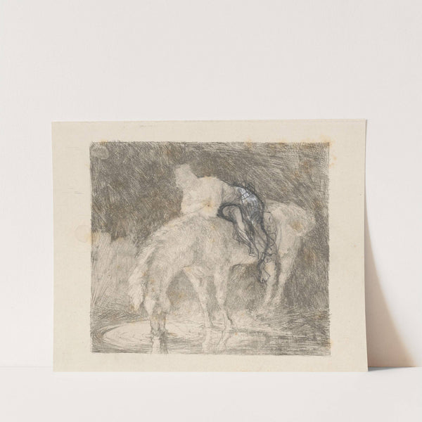This stunning art print, "Amazone ihr Pferd tränkend" by Albert Welti, captures the serene beauty of a white horse drinking water in a softly rendered, impressionistic style. The delicate, textured brushstrokes create a sense of movement and depth, with soft...