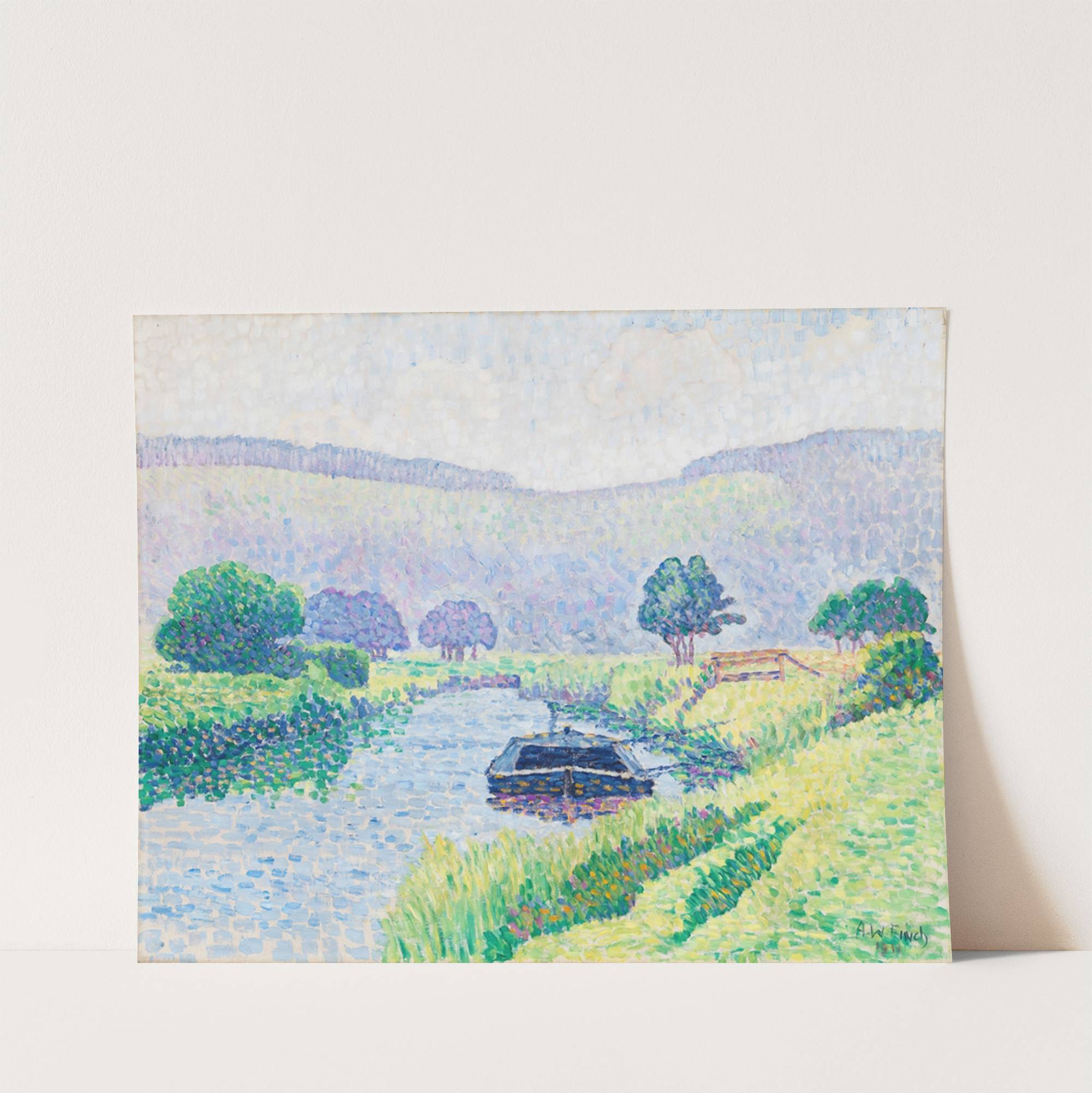 This vibrant landscape print by Alfred William Finch features a serene riverscape in an impressionist style. Dominated by bright, eye-catching colors, the image showcases a lush green field on one side and a tranquil river flowing gently through the center....