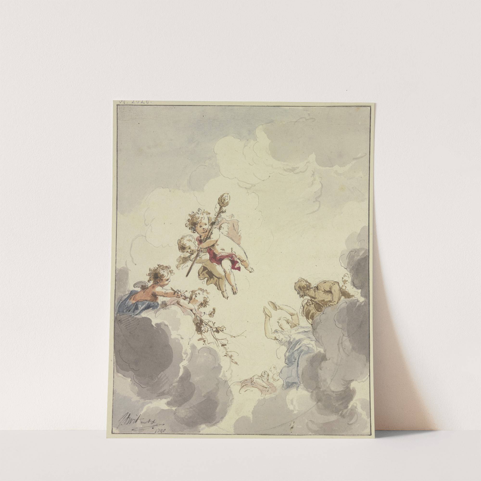 Amoretten mit einem Thyrsusstab und Bacchanten in Wolken (1740) by Jacob de Wit - Wall Art Print