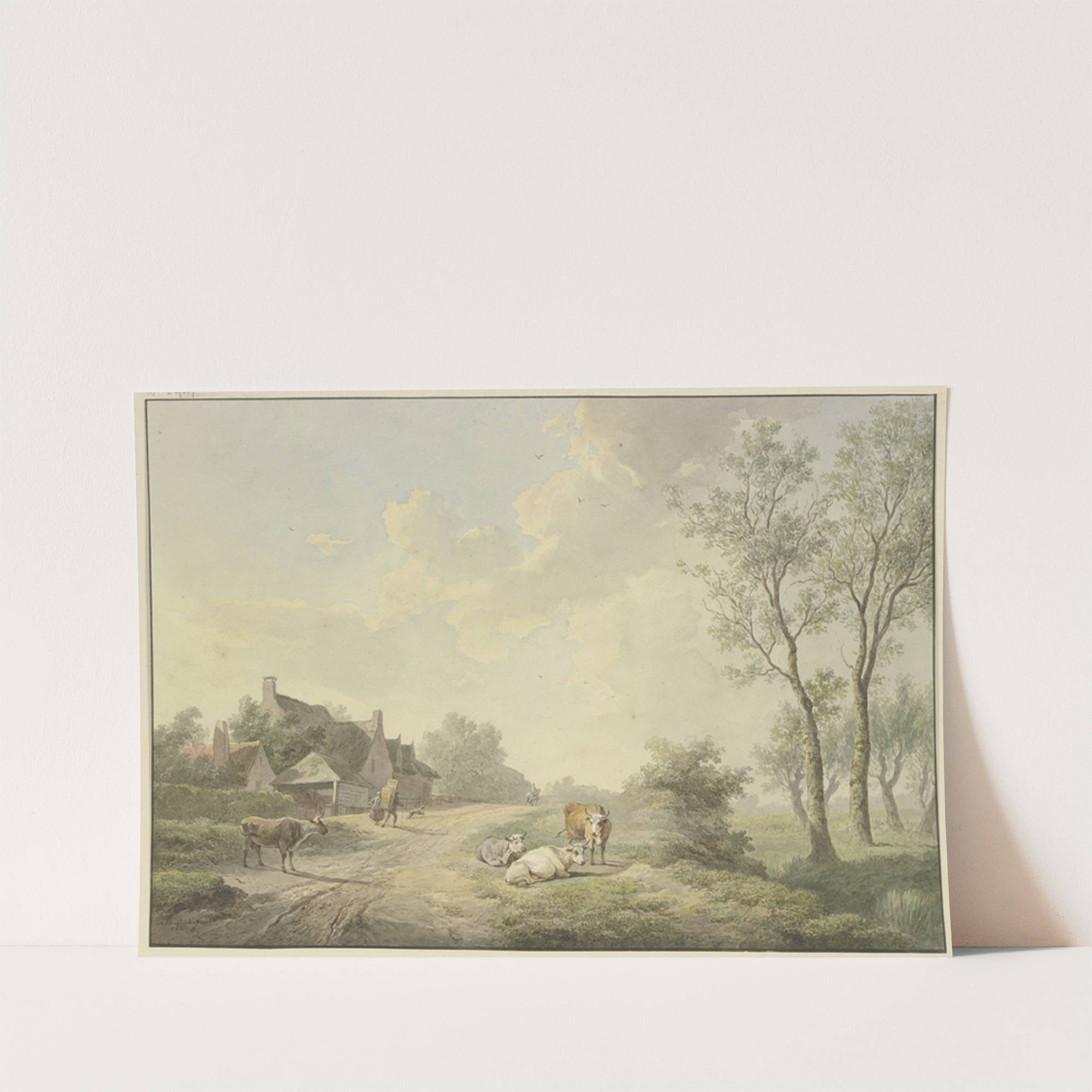 This art print features a serene rural scene titled "An einem Weg bei Bauernhäusen vier Kühe" by Abraham Teerlink, capturing the peaceful essence of countryside life. The soft pastel hues and delicate brushstrokes bring to life a sunny afternoon in...