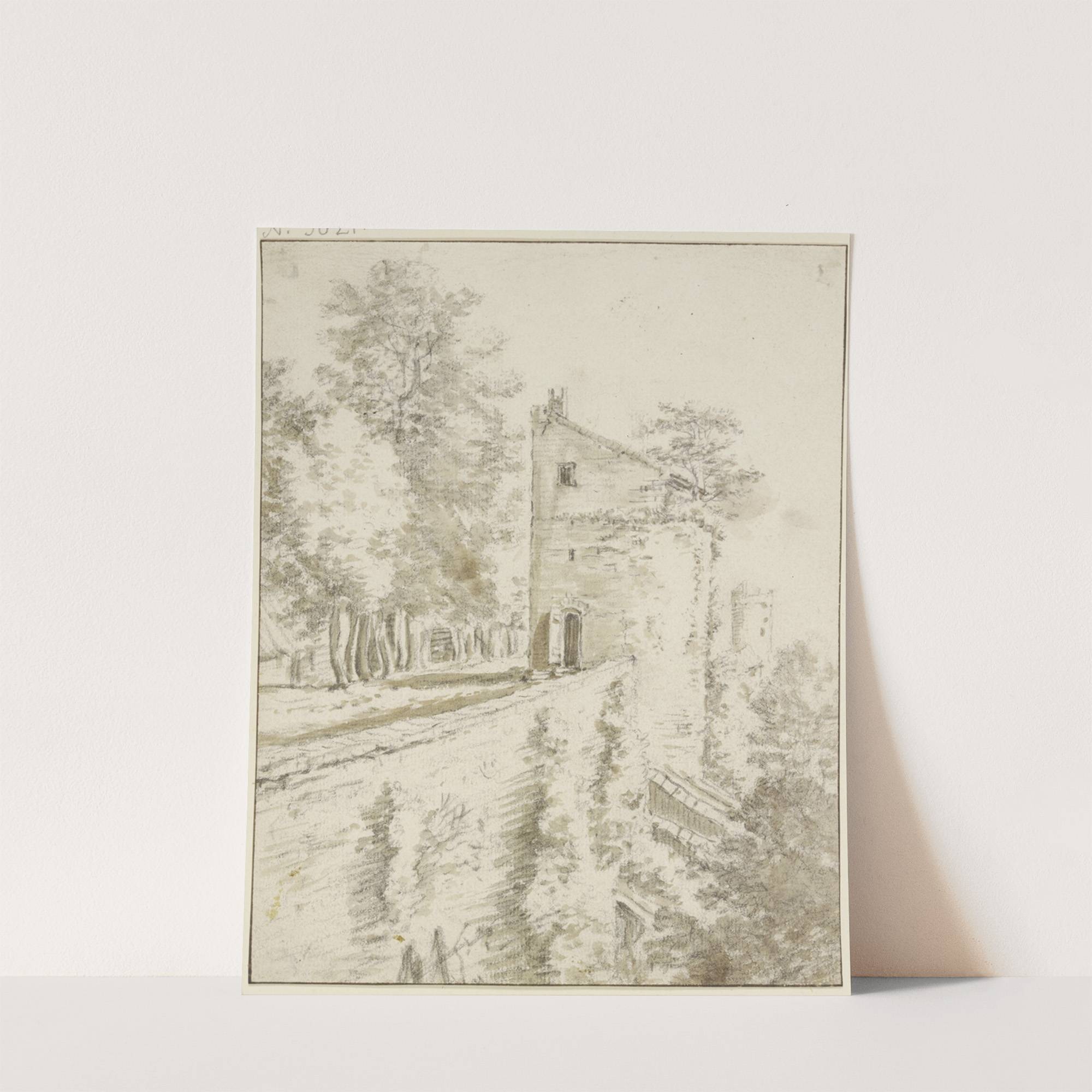 An einer hohen Mauer ein Haus, auf dem ein Bäumchen wächst by Herman Saftleven III - Wall Art Print