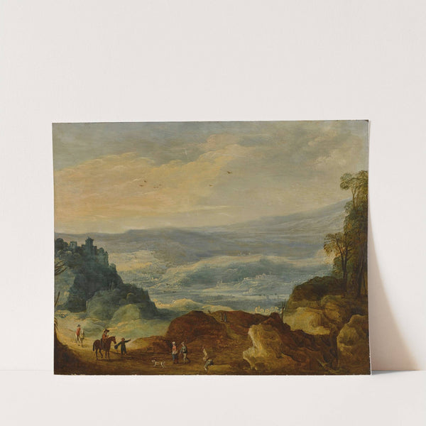 An extensive river landscape with peasants and horsemen in the foreground by Workshop of Joos de Momper - Wall Art Print