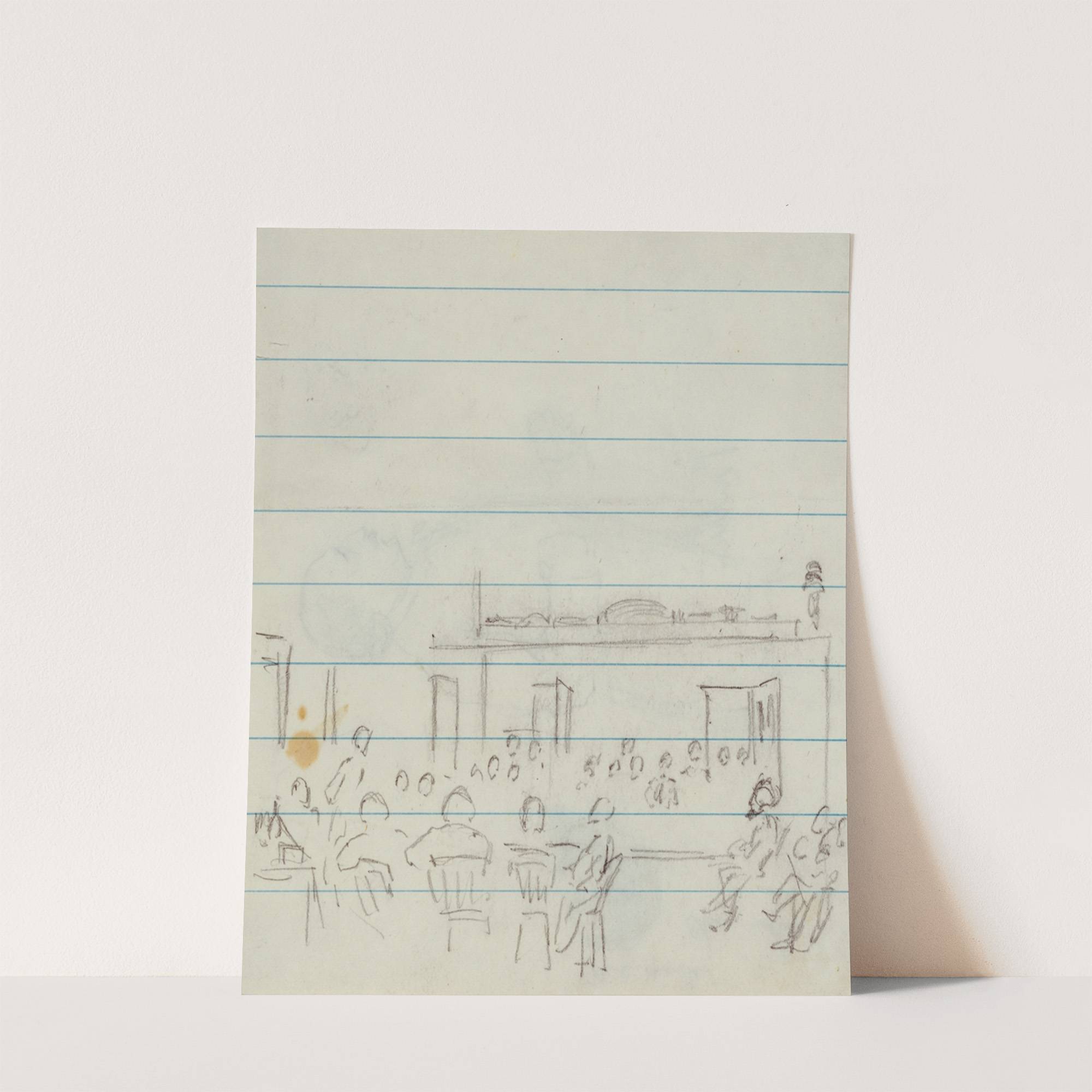 This is a charming hand-sketched drawing of an assembly hall, created in a loose pencil style on lined paper. The sketch captures the essence of an auditorium filled with numerous people seated in rows, attentively listening to a speaker at...