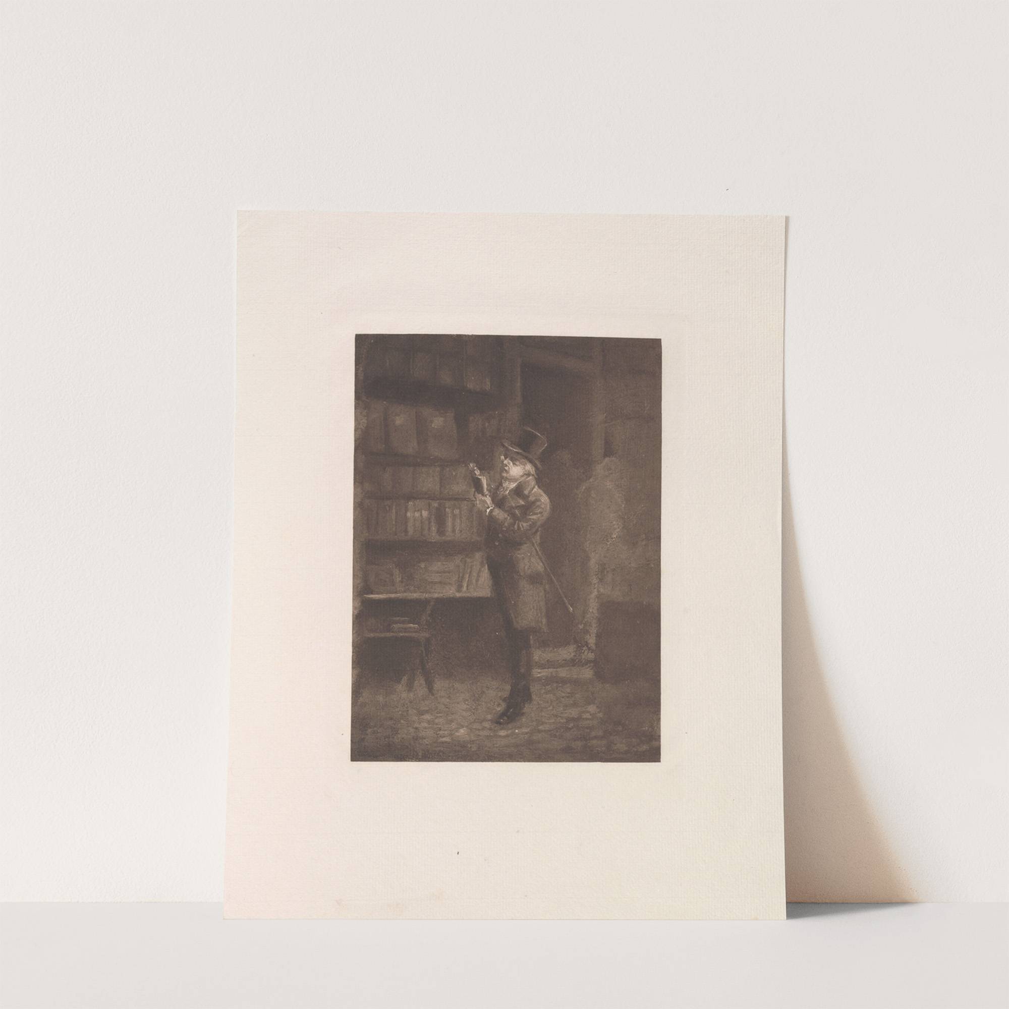 This art print features a sepia-toned illustration by Lionel Charles Henley titled "An Odd Volume." The image depicts a man standing in what appears to be an old bookstore or library. He is dressed in period-style attire, including a long...