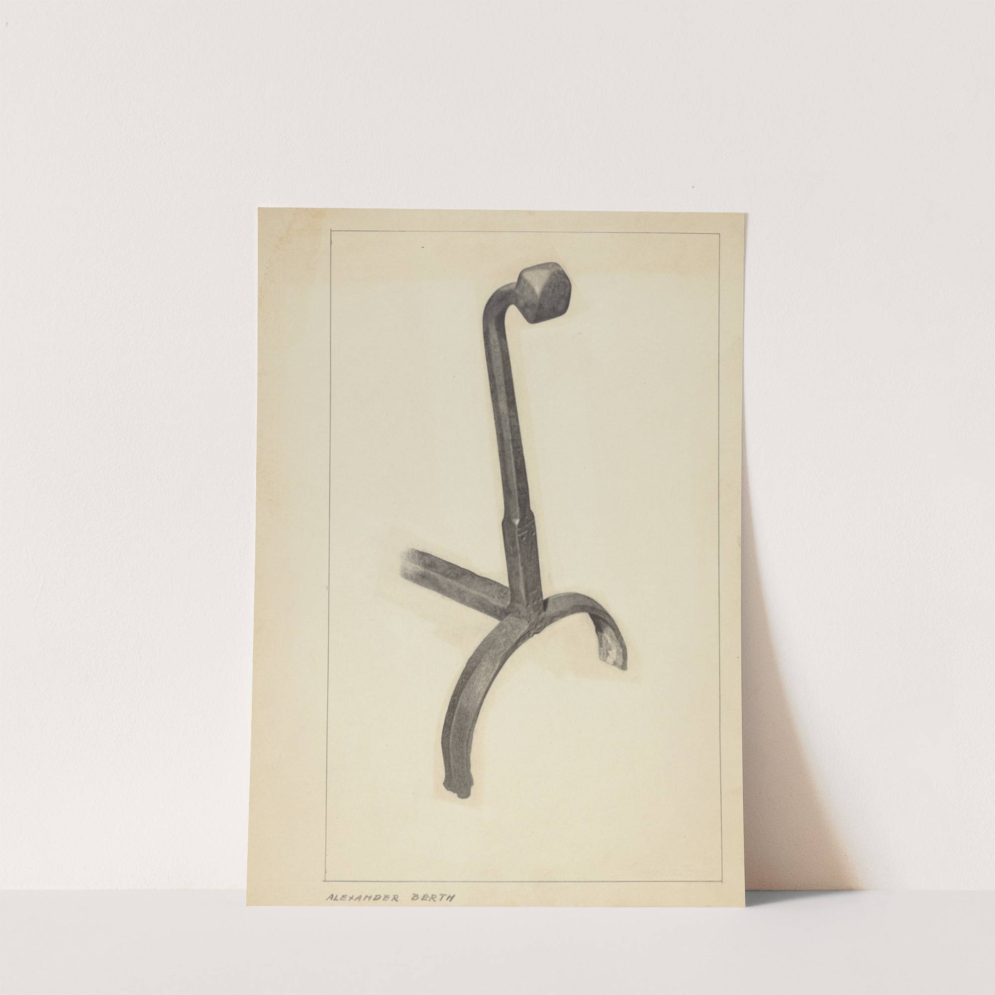 This print features "Andiron," a minimalist yet striking piece created by artist Alexander Berth. The artwork showcases an abstract black metal andiron, rendered in soft charcoal hues that lend it a tactile, almost three-dimensional quality. The form of the andiron...