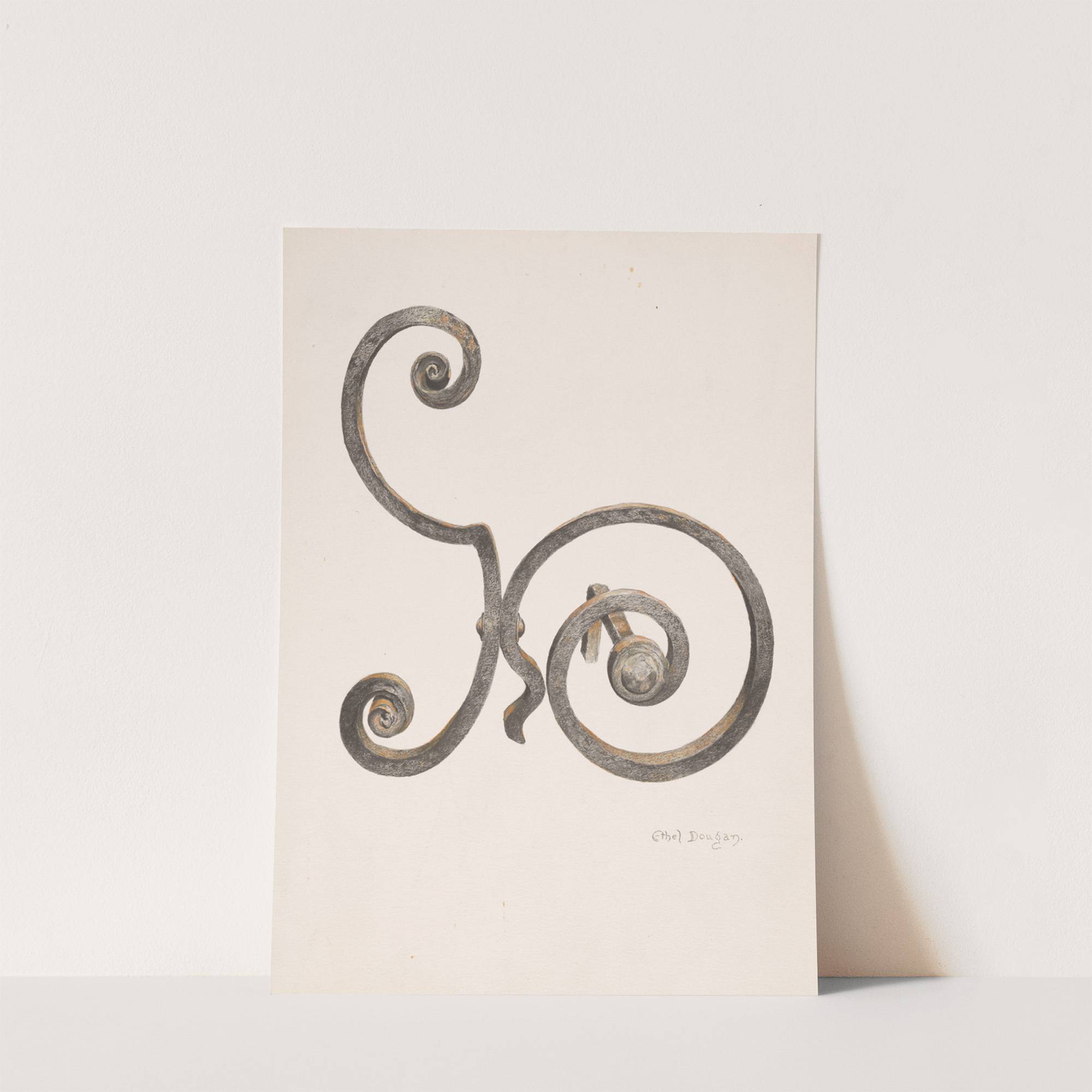 "Introducing 'Andirons' by Ethel Dougan – a striking piece of art that combines elegance with intricate design. This artwork features a detailed wrought iron pattern, meticulously drawn to showcase graceful swirls and curves that intersect in a harmonious balance. The...