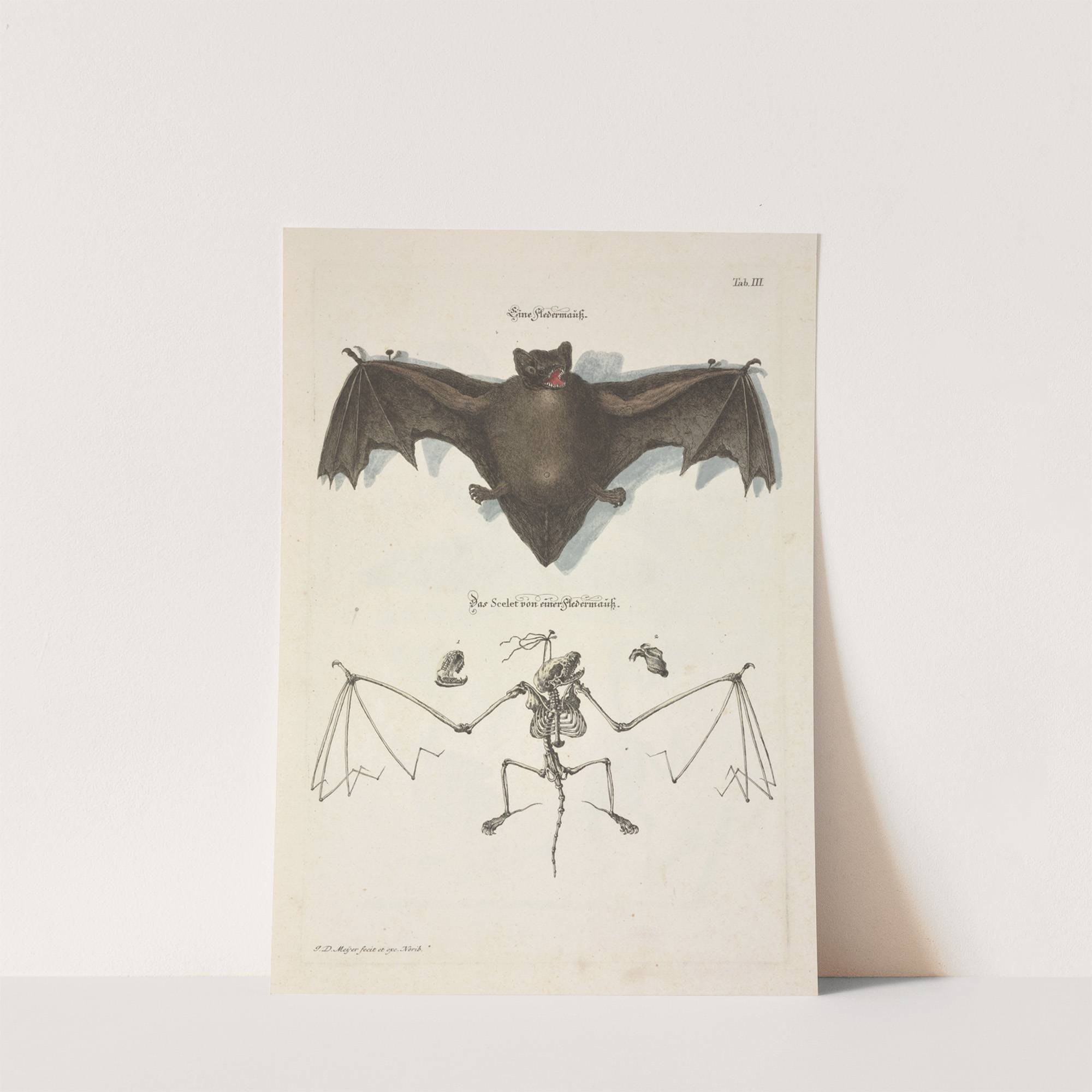 This art print features two striking illustrations of bats, presented in a detailed and artistic manner. The top illustration showcases a full-body bat with dark brown wings extended outward, revealing the membrane texture and intricate wing structure. The bat's face...