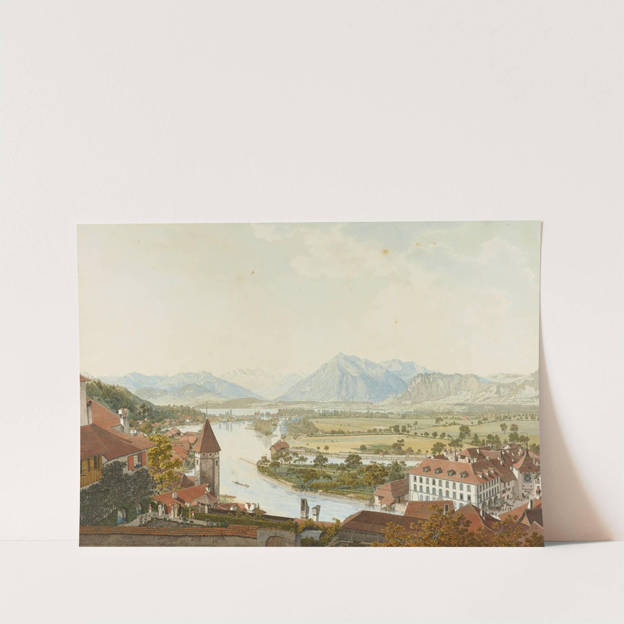 Transform your space with the enchanting "Apollo Theater" landscape print by Knut Hansen, created in 1900. This captivating artwork captures the serene beauty of a small European town nestled beside a gentle river, surrounded by majestic mountains under a soft,...