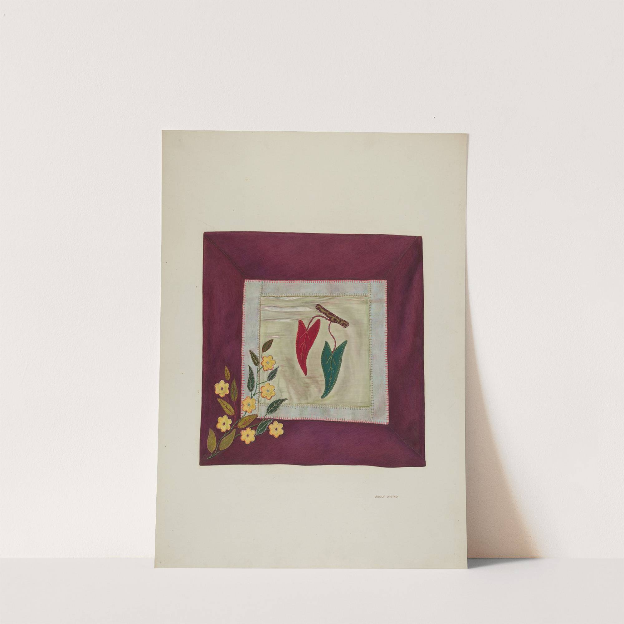 This exquisite art print features "Appliqué Coverlet (Detail)" by Adolph Opstad. The piece showcases a charming and delicate appliqué design set against a rich burgundy backdrop. At the center, a soft white square is bordered with fine grey stitching, highlighting...