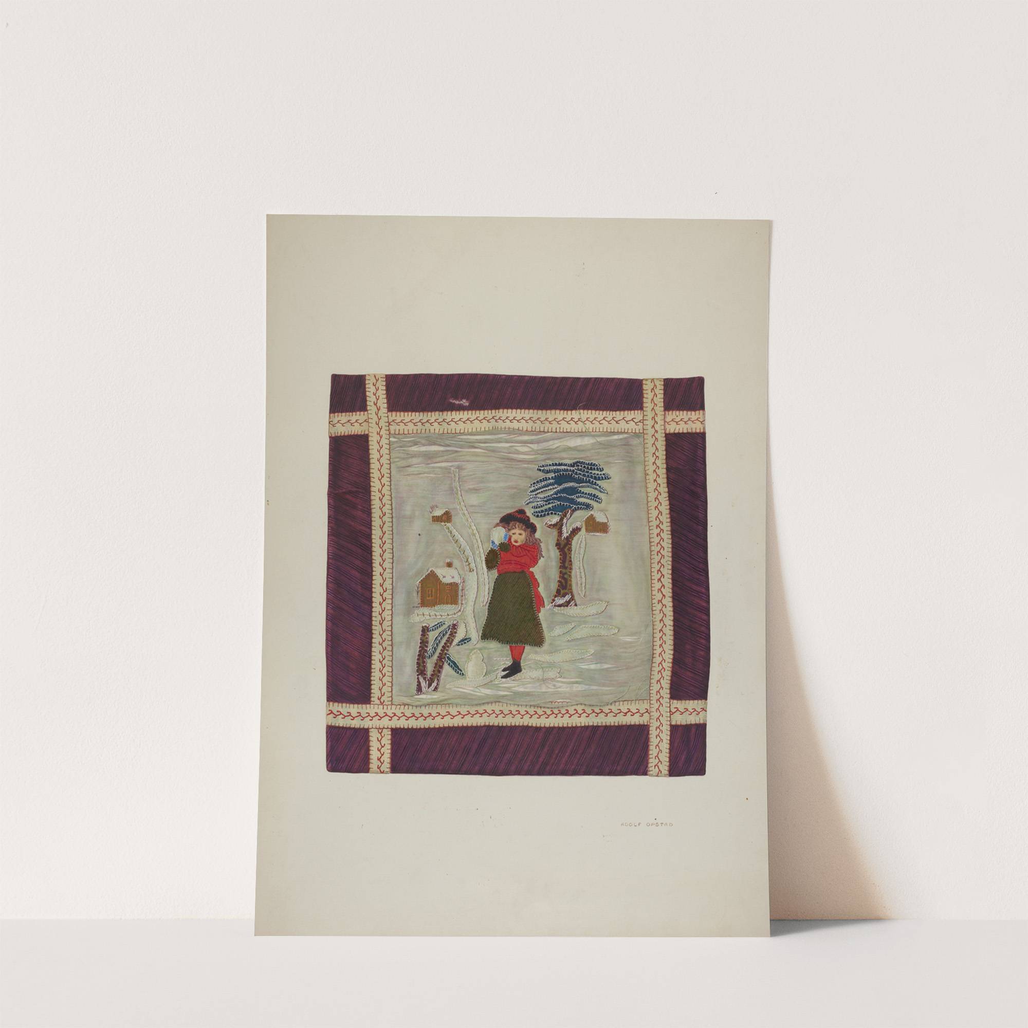 This charming art print features "Applique Coverlet" by Adolph Opstad, showcasing a whimsical winter scene. The central figure is a young girl dressed in a bright red coat, dark green skirt, and matching hat, standing amidst a snowy landscape. Her...