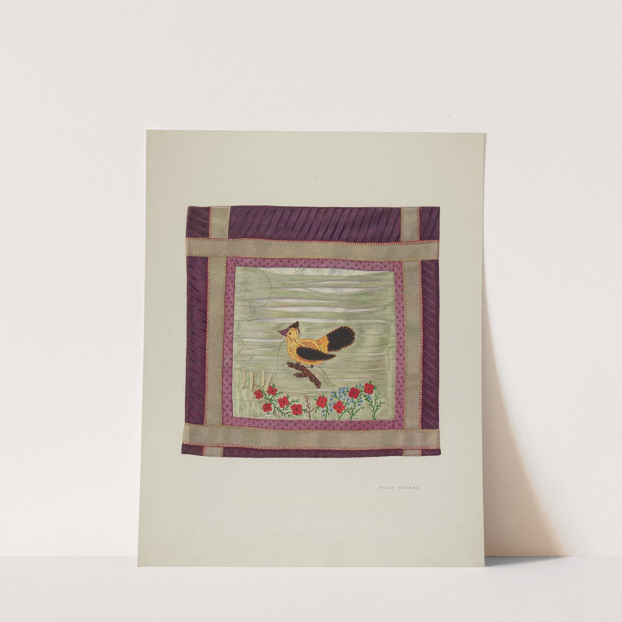 This exquisite art print features "Applique Coverlet (Detail)" by Adolph Opstad. The central focus is a beautifully embroidered bird in vibrant hues of yellow, black, and brown, perched gracefully against a serene backdrop. The background consists of soft green tones...