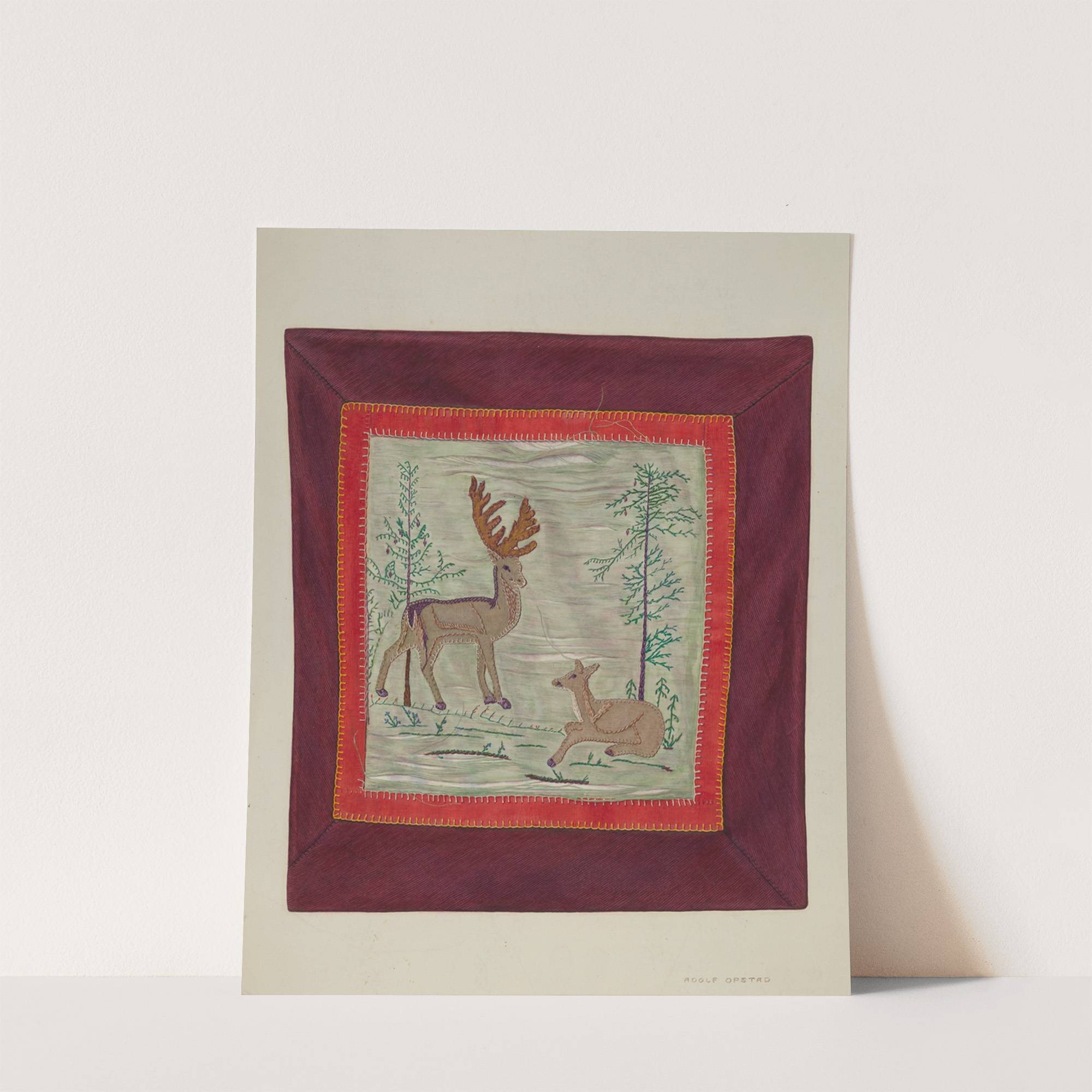 This vibrant art print features "Appliqué Coverlet (Detail)" by Adolph Opstad, showcasing a serene winter woodland scene with rich, earthy colors. The central focus is on two deer: a majestic male with impressive antlers stands proudly on the left, while...