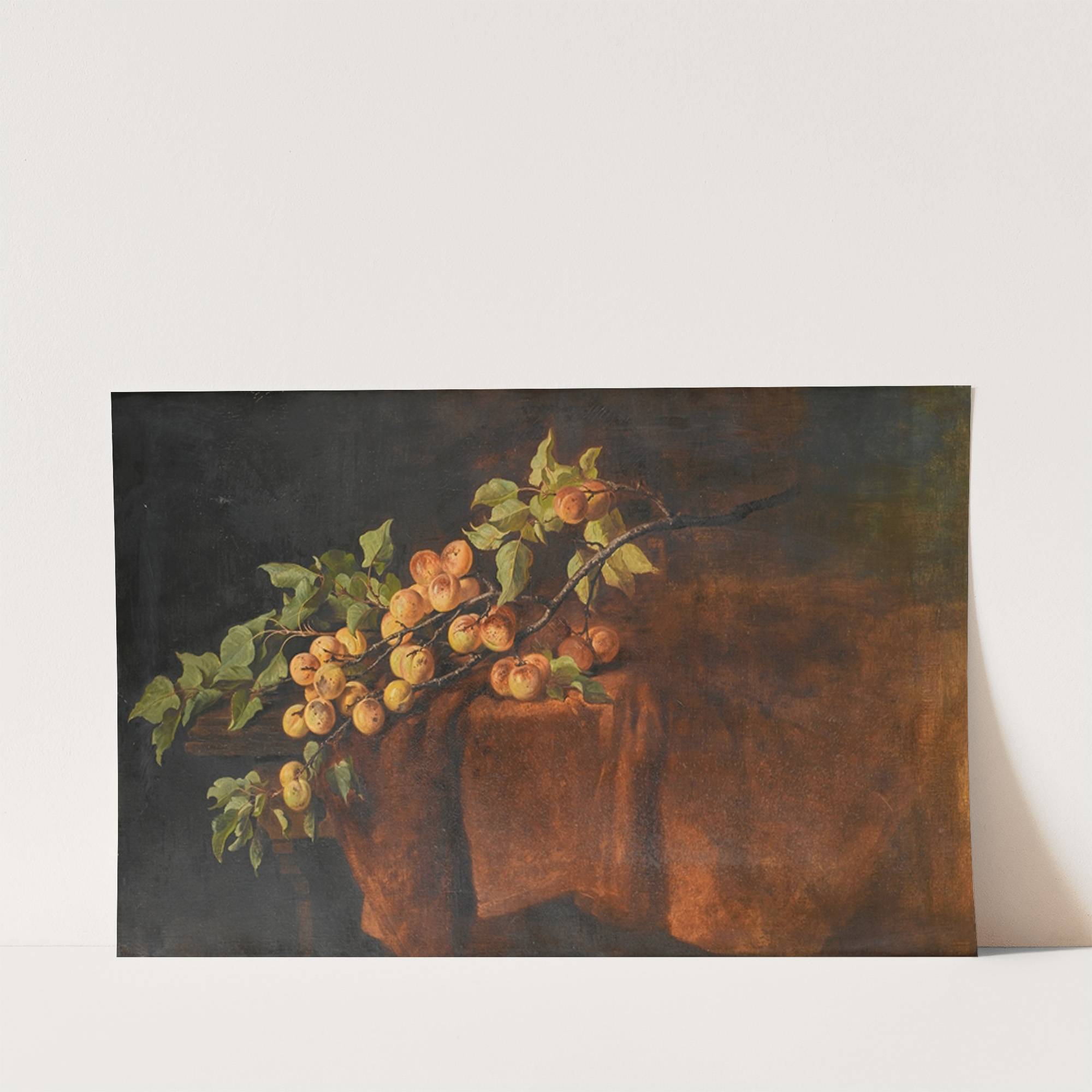 This artwork by Adam Ludwig Kunz titled "Aprikosenzweig" is a masterful oil painting that showcases a still life composition with exquisite detail. The central focus of the piece is a delicate branch adorned with clusters of ripe apricots, their warm,...