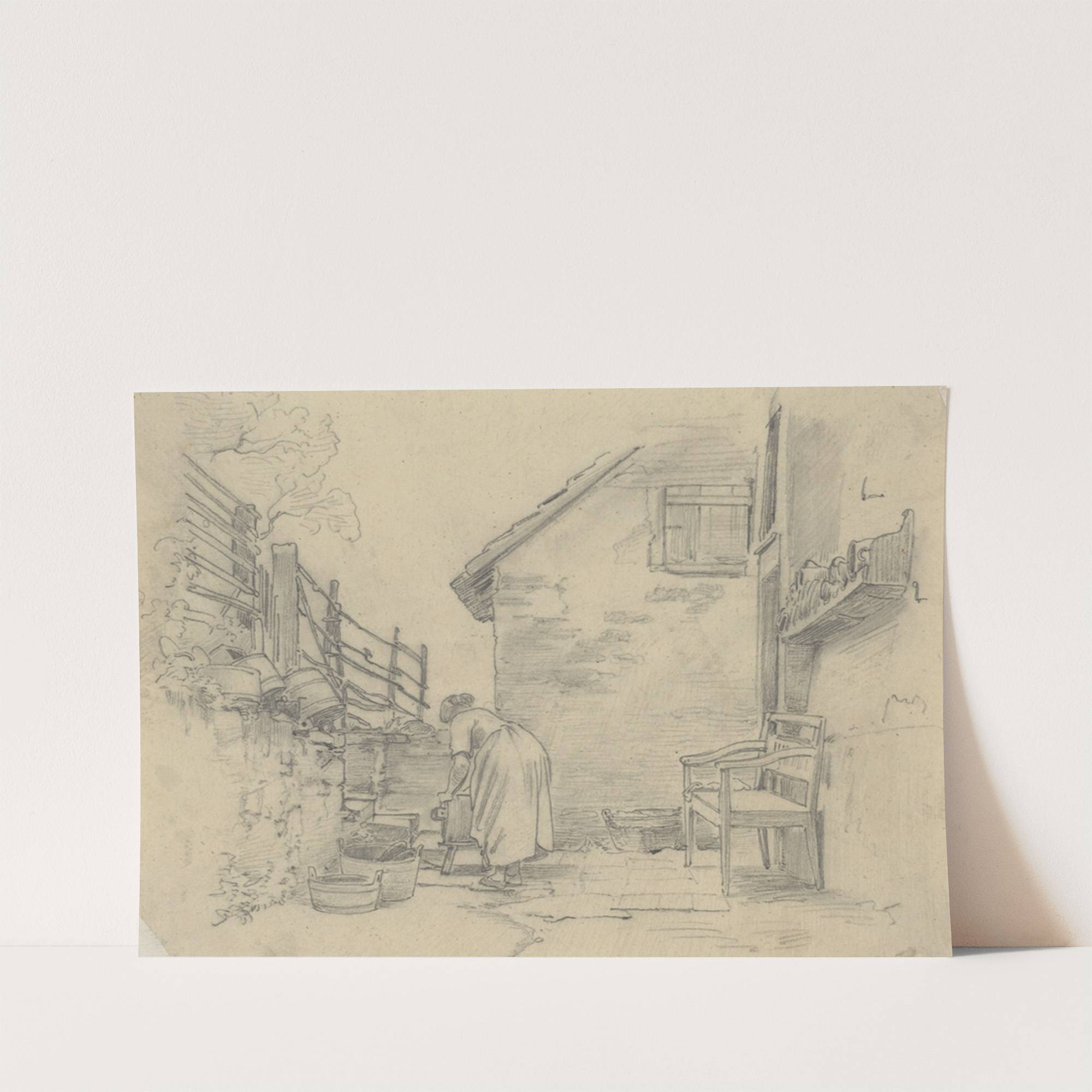 Arbeitende Frau vor einem kleinen Haus by Jakob Becker - Wall Art Print