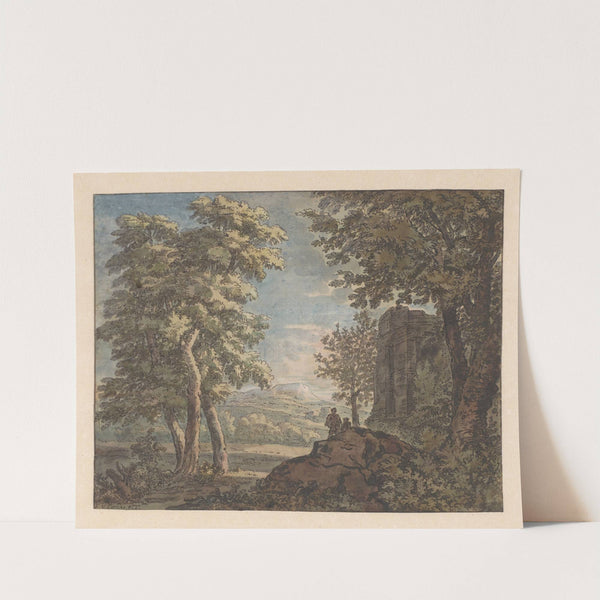Arcadisch landschap met antiek bouwval en twee mannen by Jacob van Liender - Wall Art Print