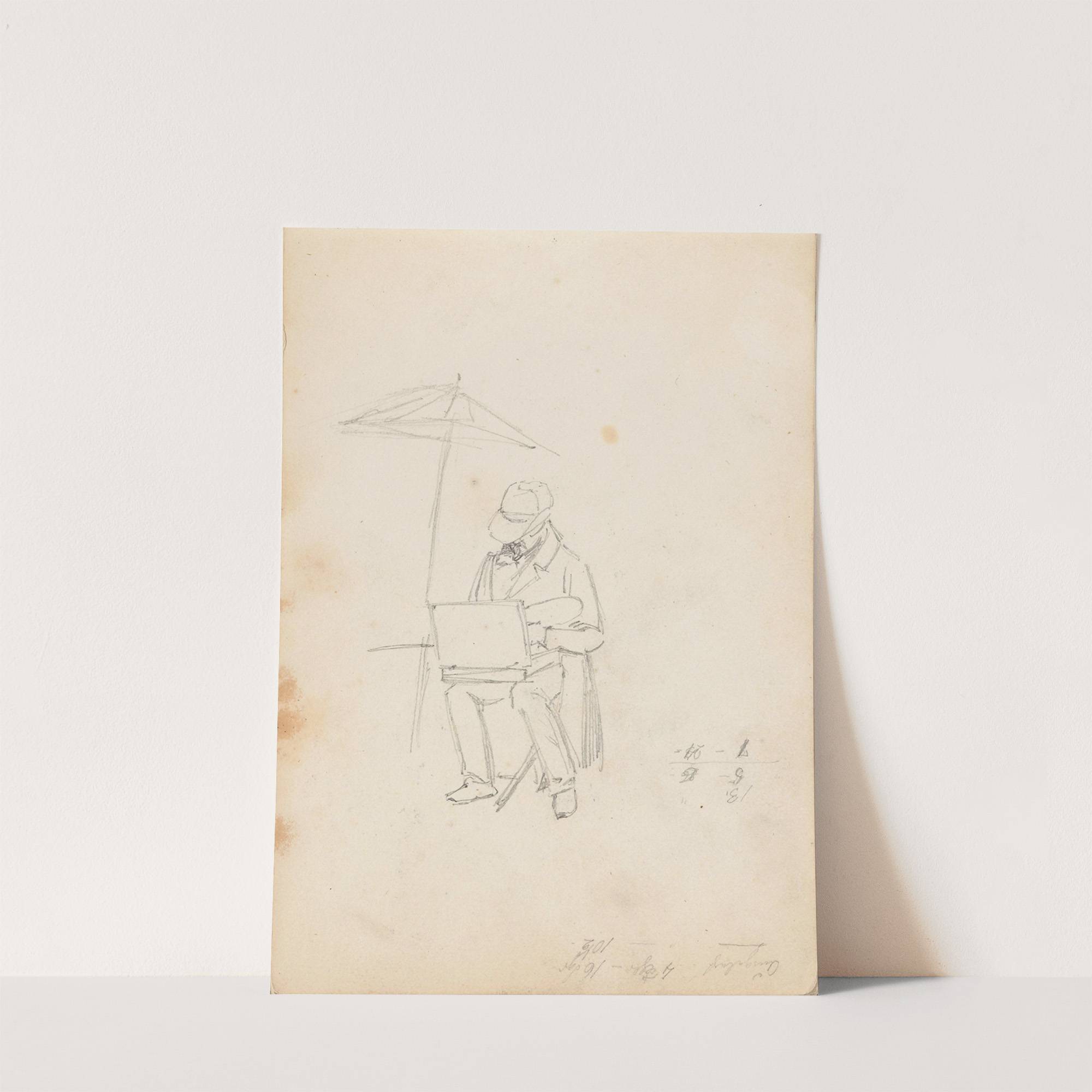 This elegant drawing, titled "Artist under Parasol" by Adolph Tidemand, showcases a minimalist, monochromatic sketch of an artist at work. The artist is seated with a slight forward tilt on a simple bench, his attention focused intently on the painting...