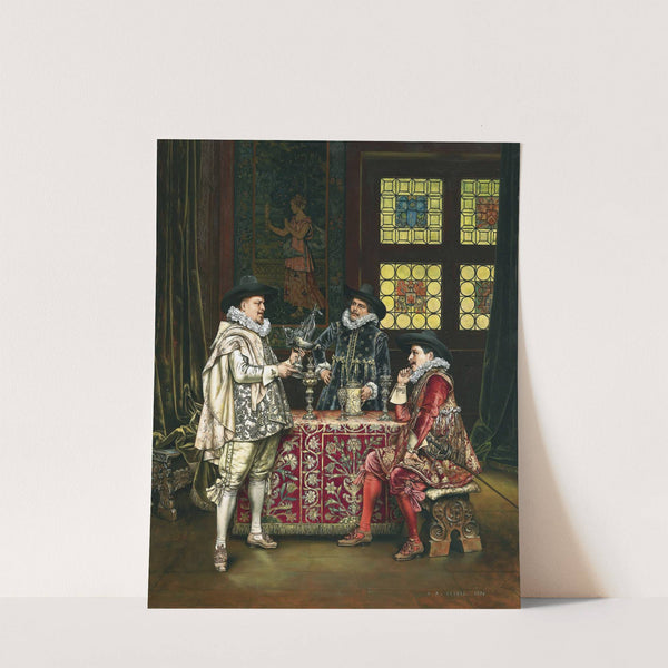 This vibrant art print by Adolphe-Alexandre Lesrel captures the rich opulence of a baroque-style room adorned with dark, luxurious drapes and intricate stained glass windows that allow a warm glow to seep in. At the center of the composition are...