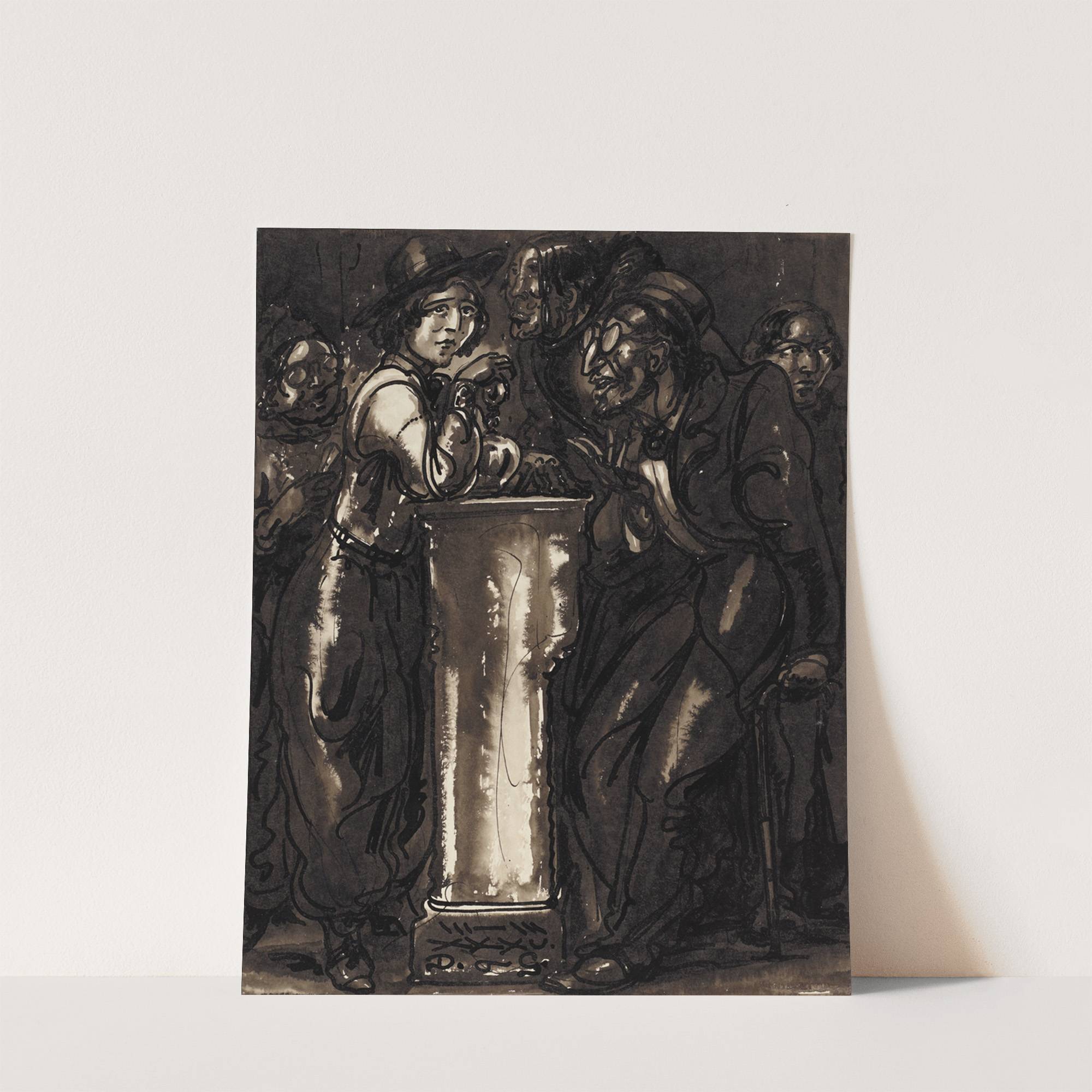 This captivating art print depicts "Au Comptoir (Bar)" by Alfred Ost from 1935, rendered in a dramatic monochromatic sepia tone. The composition features a group of men gathered around a brightly illuminated metal box at the center, creating a stark...