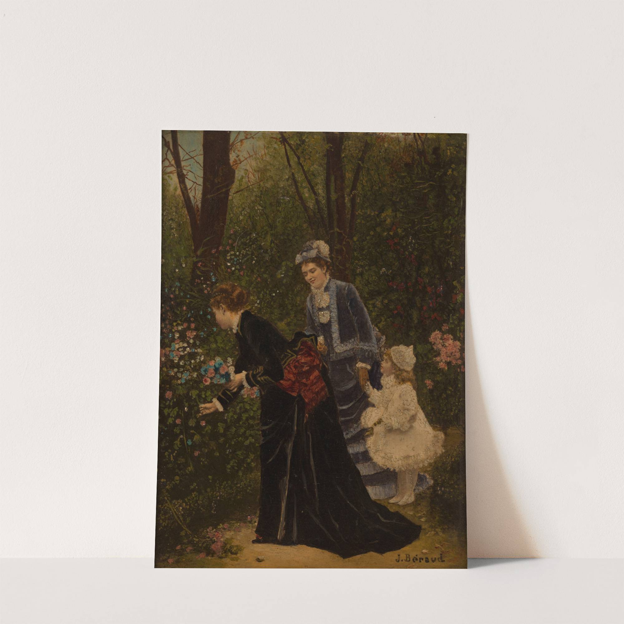 This elegant art print depicts "Au Jardin" by Marie-François Firmin-Girard, capturing a charming outdoor garden scene in classic Victorian style. The composition features a mother and her young daughter amidst lush greenery and vibrant blooming flowers, including pink and blue...