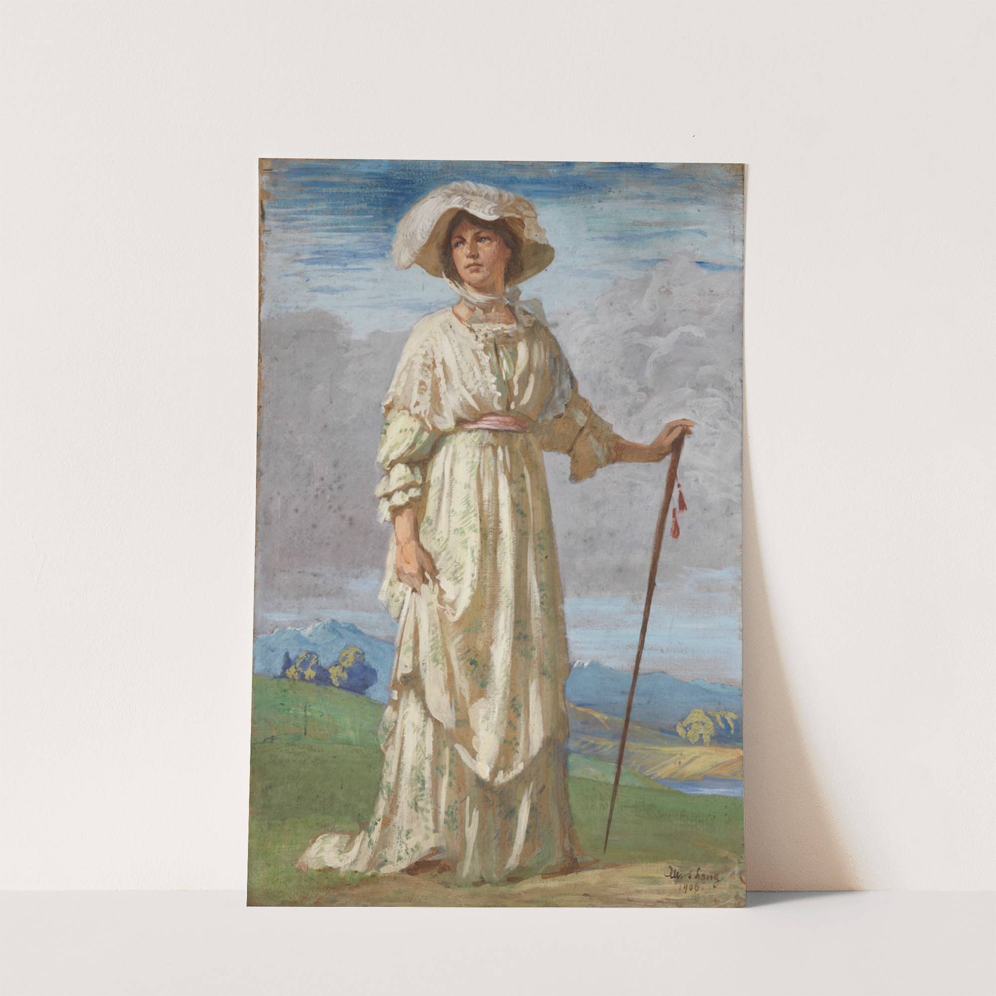 This exquisite painting titled "Auf dem Spaziergang" by Albert Lang captures a serene and contemplative moment in the artist's style of realism with delicate impressionistic touches. The subject is a young woman standing gracefully on an open field under a...