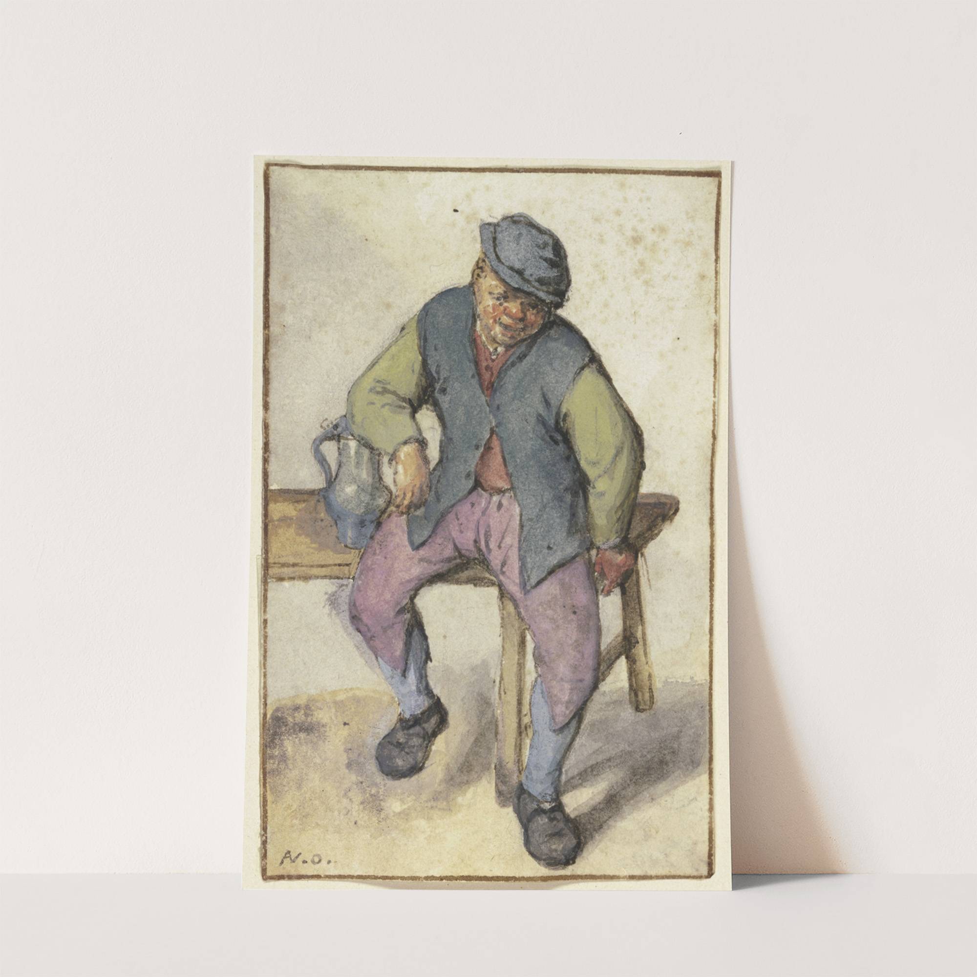 This charming artwork, "Auf einem Tisch sitzender Bauer" (Seated Peasant) by Adriaen van Ostade, presents a rustic scene captured with vibrant yet earthy colors. The central figure is an older peasant man, depicted in traditional rural attire. He sits on...