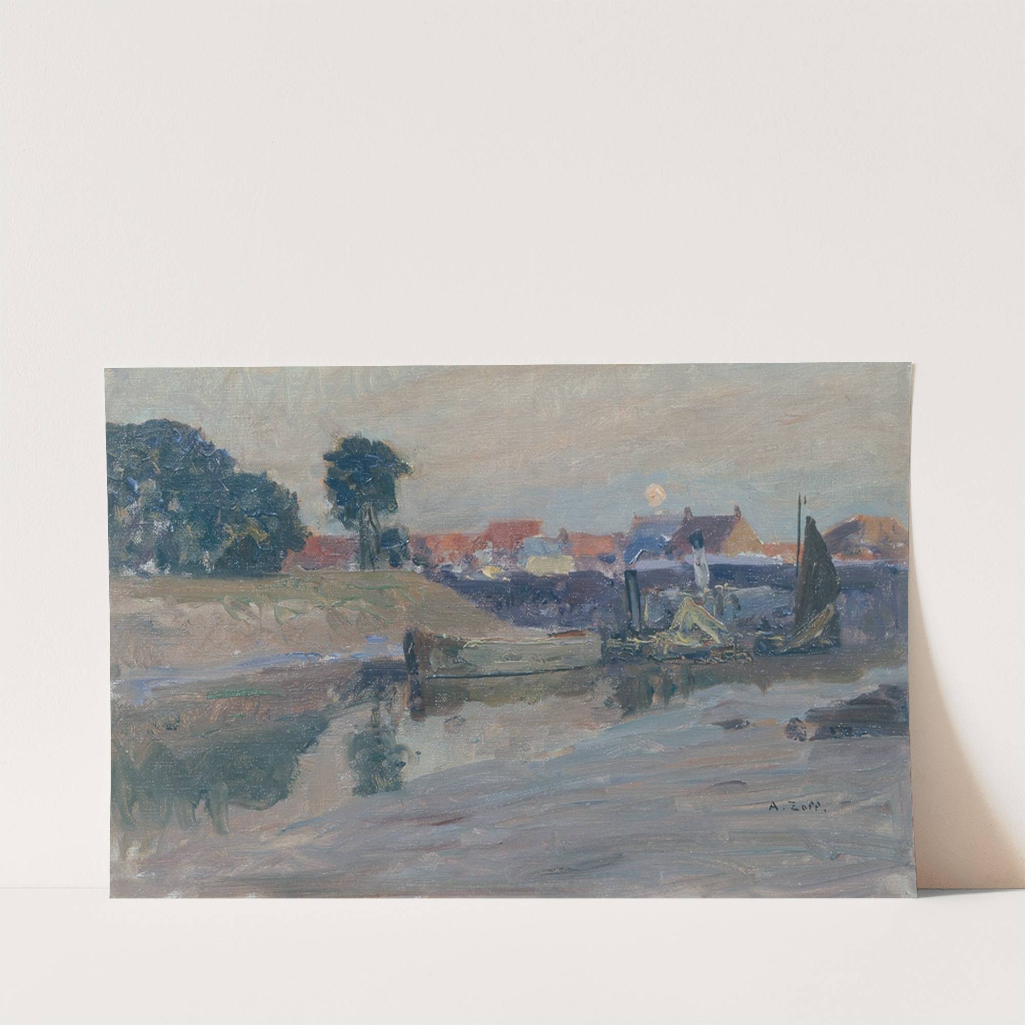 This artwork titled "Aufgehender Mond über Nieuport" by Alfred Zoff offers a serene and picturesque maritime scene captured in a soft, impressionistic style. The painting features a tranquil river reflecting the delicate hues of a twilight sky. In the foreground,...
