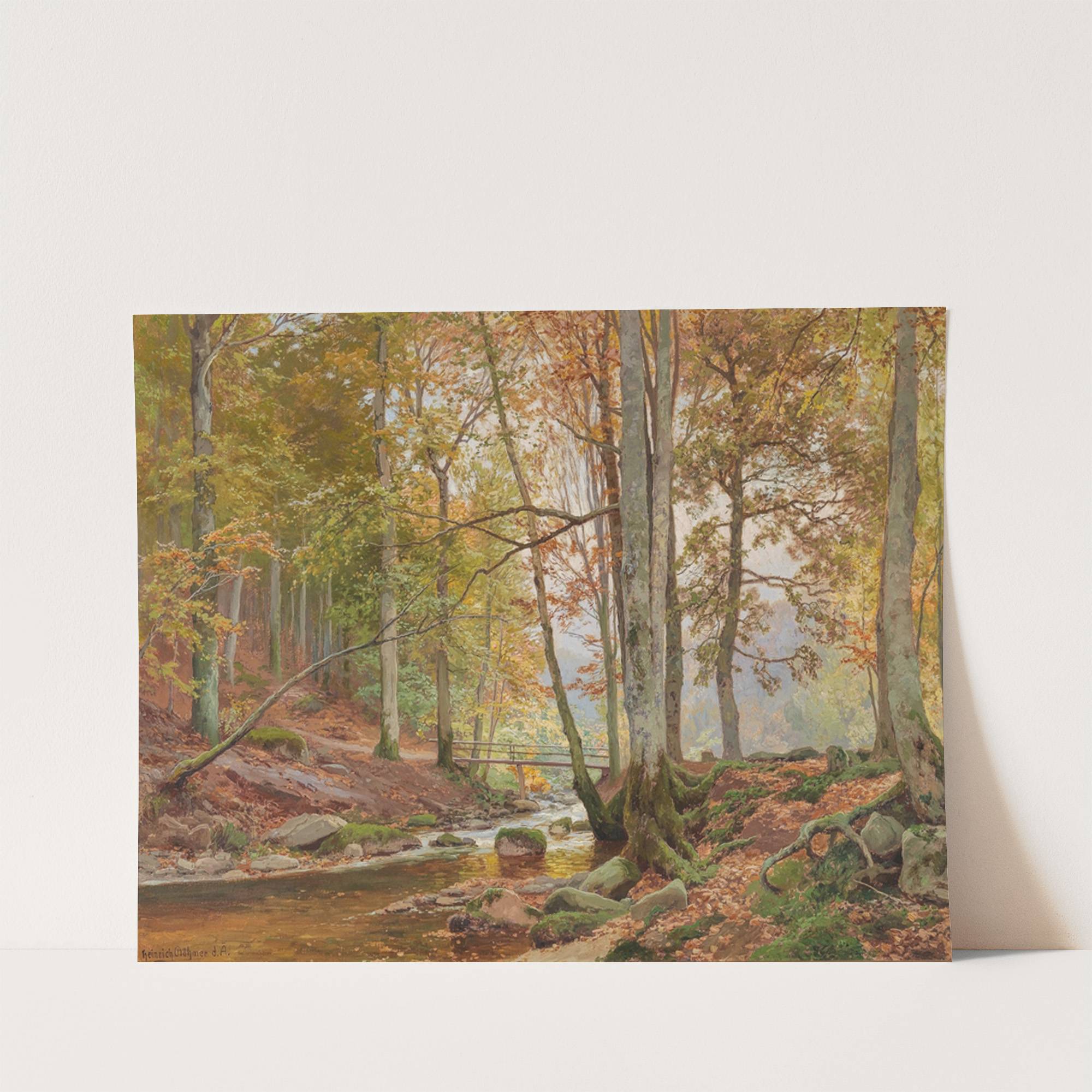 Autumn Woodland with Bridge over a Stream by Heinrich Böhmer - Wall Art Print