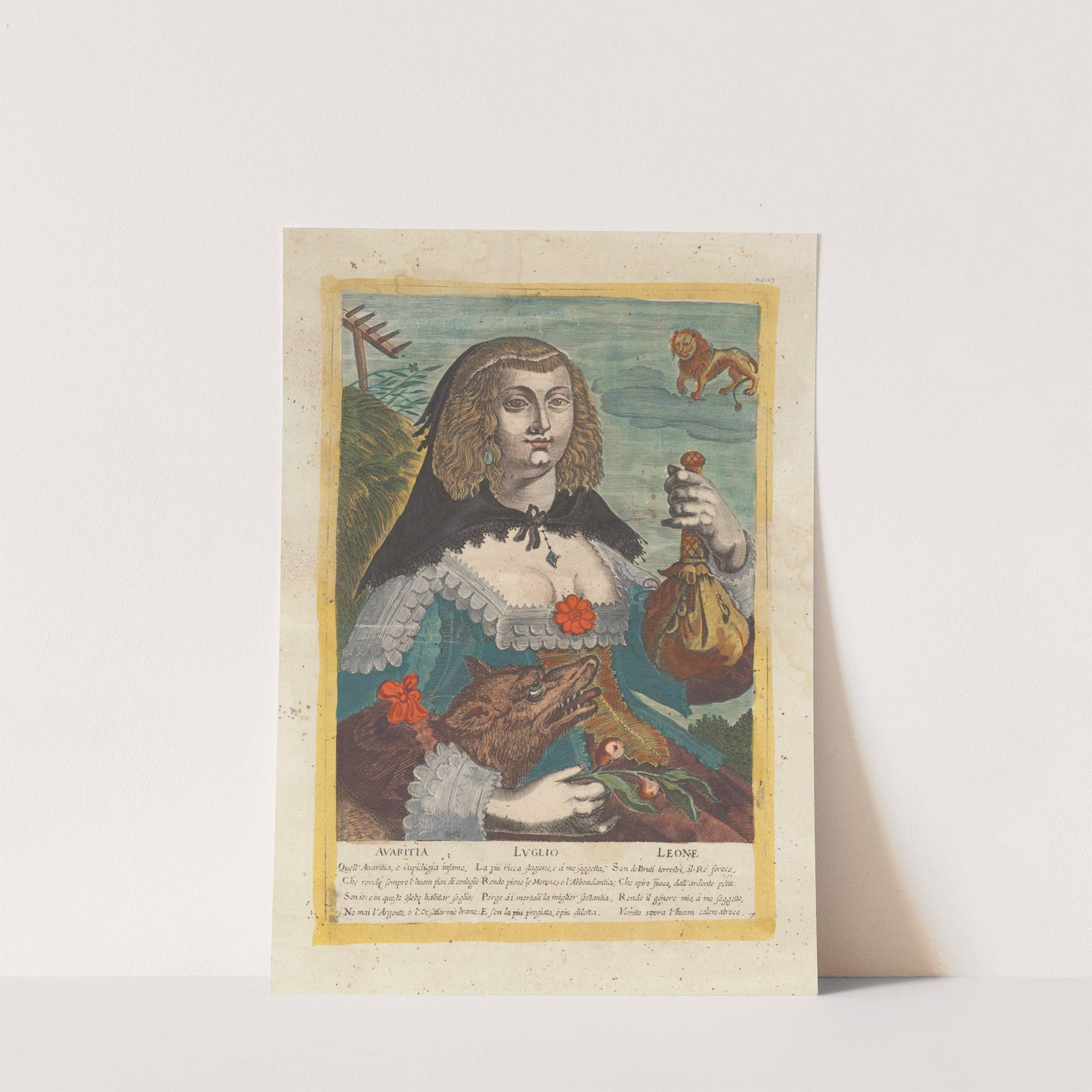Discover the enchanting world of traditional Italian folk art with this captivating print featuring "Avaritia – Luglio – Leone" by Alessandro Temini. This vividly colored piece showcases a young woman in Renaissance-style clothing, adorned with delicate lace and vibrant red...