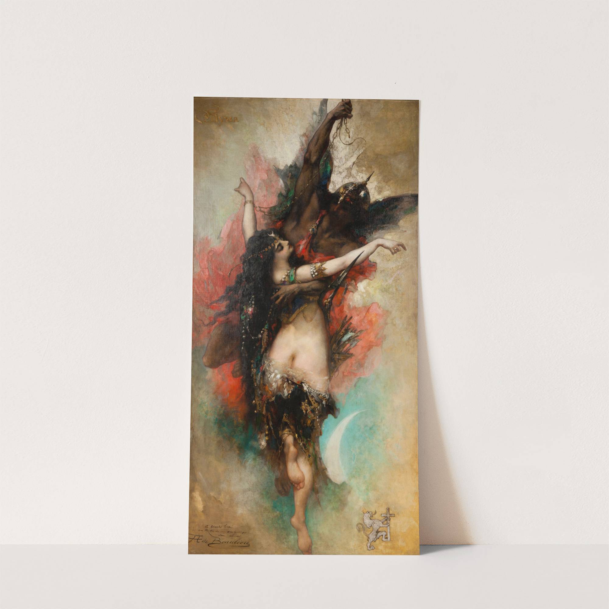 This evocative art print titled "Ayma" by Anatole Henri de Beaulieu captures the ethereal beauty of a dancer in mid-motion. The central figure is a graceful woman with flowing, dark brown hair that appears to be swirling around her like...