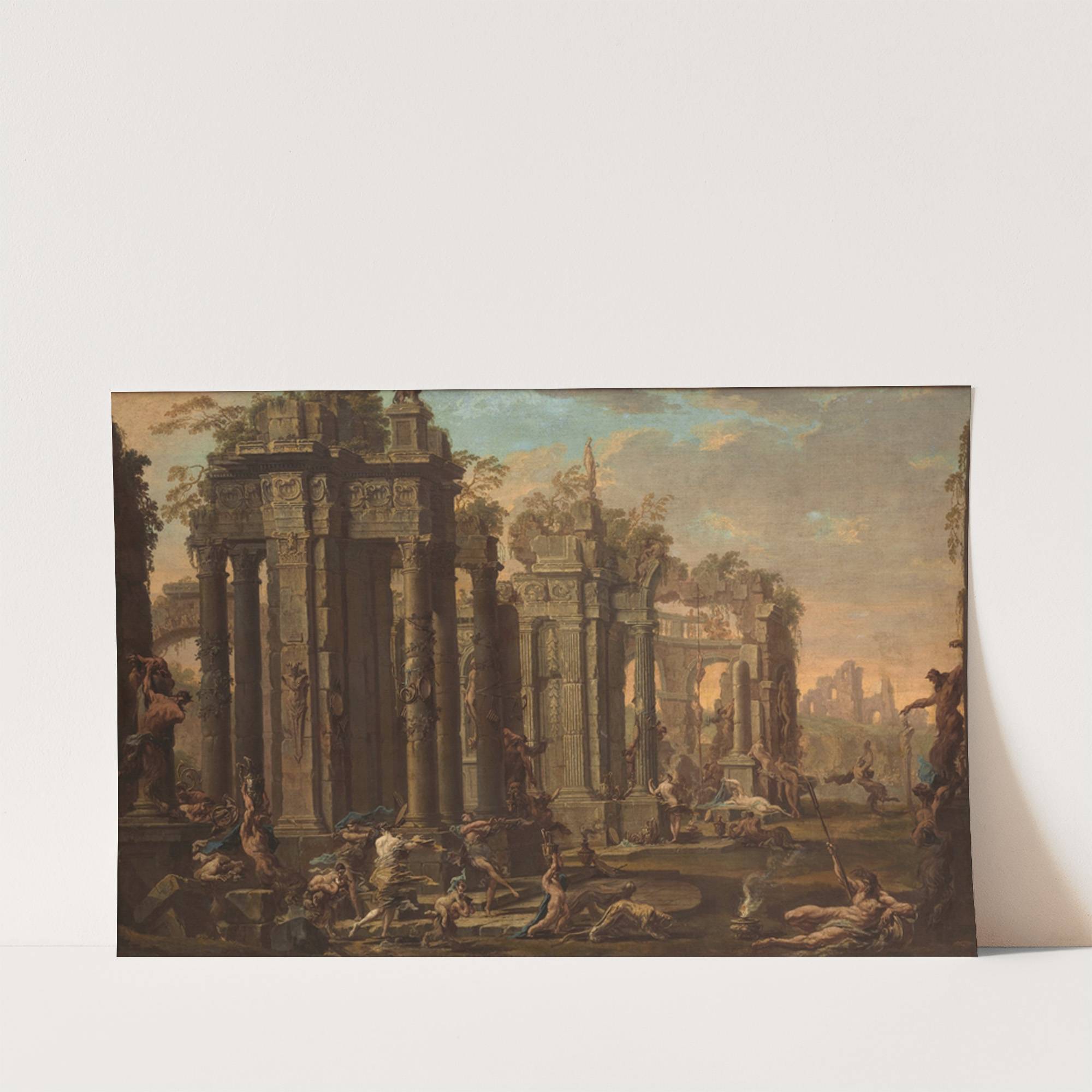 This art print captures "Bacchanal" by the renowned artist Alessandro Magnasco in a stunning Baroque style. The composition is rich with detailed architectural elements, featuring tall, ornate columns adorned with intricate carvings and foliage at their summits. In the foreground,...