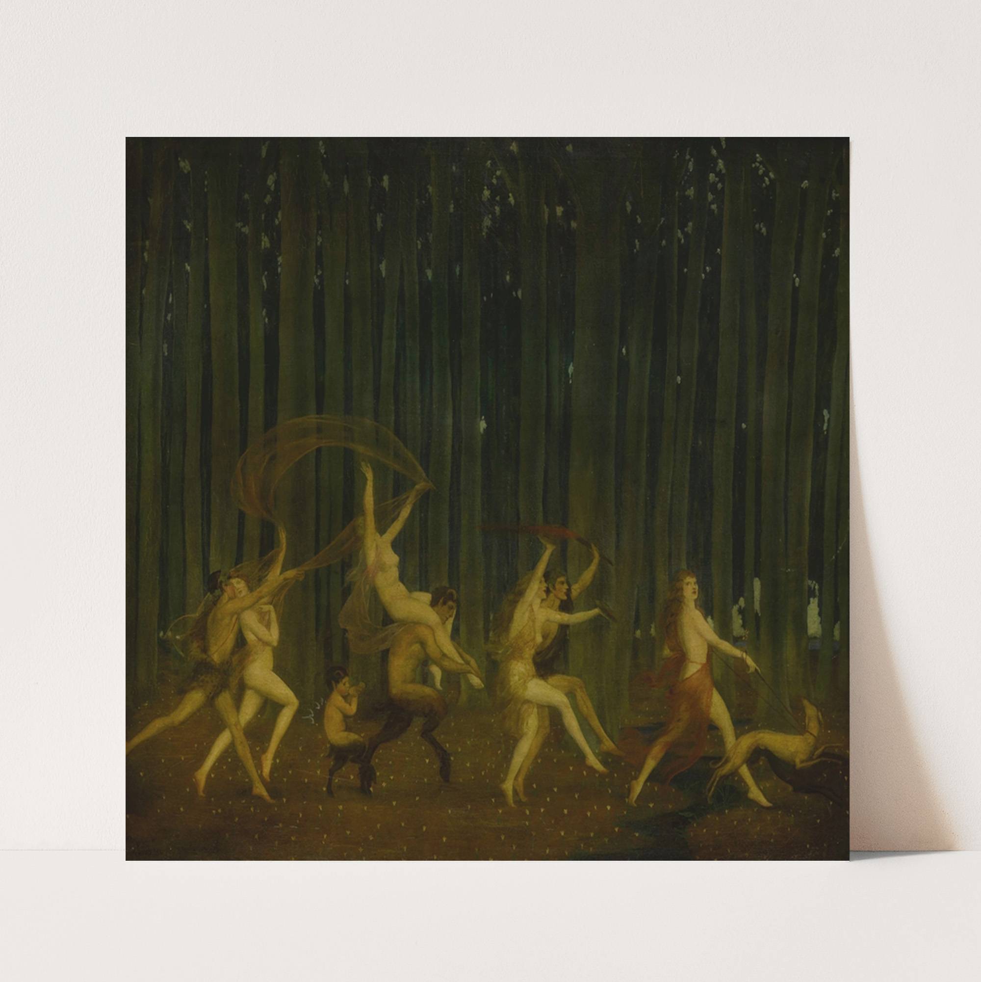 Introducing "Bacchanalian Scene" by Agnes Tai, a captivating digital painting that captures the essence of wild, uninhibited celebration in a mystical forest setting. This artwork features a group of six nude figures,The figures are depicted with delicate, ethereal coloring, with...