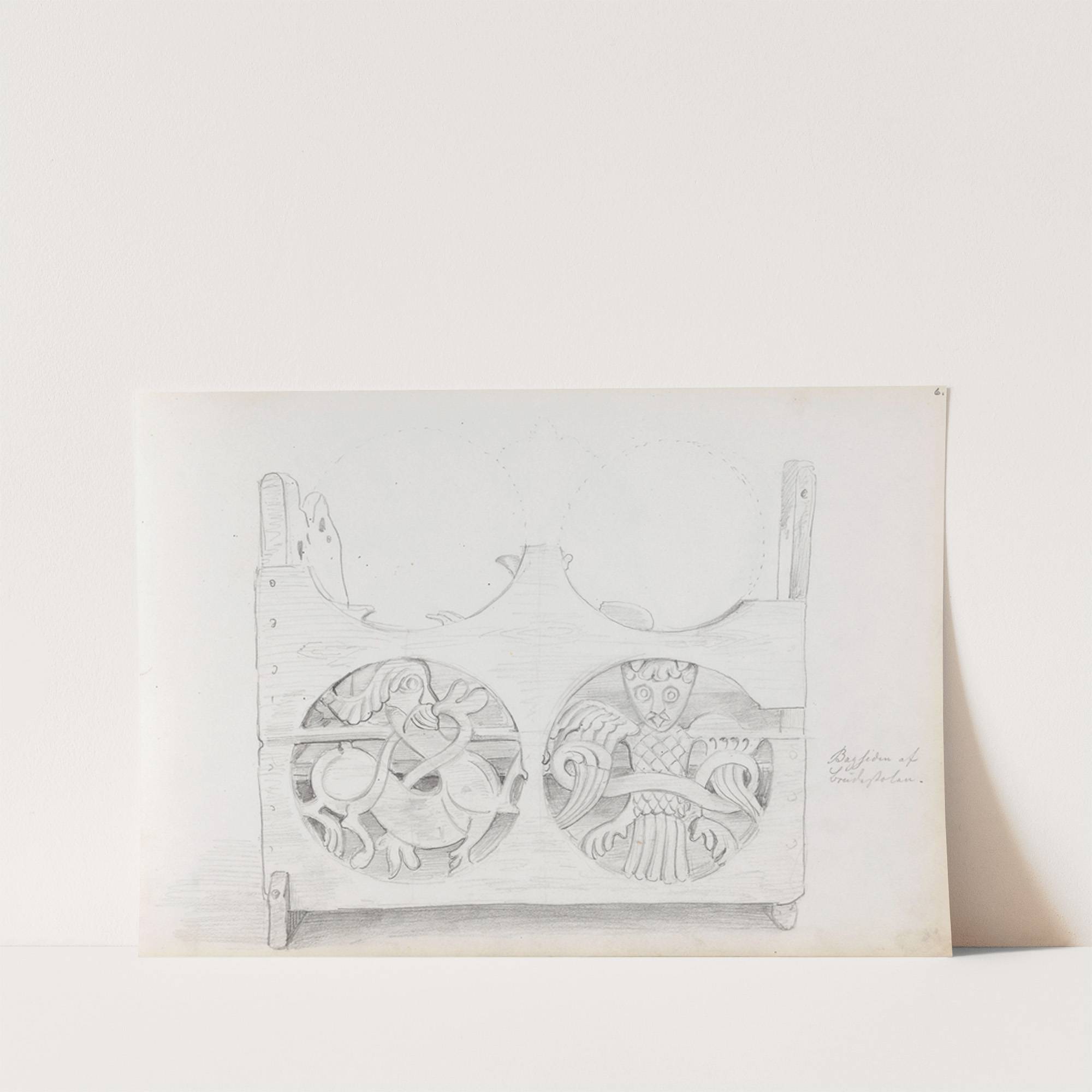 This black-and-white pencil drawing features an intricately detailed chest adorned with two prominent circular carvings. The left circle depicts a mythical creature resembling a dragon or serpent, coiled and facing upwards, with expressive, swirling lines conveying motion and texture. The...