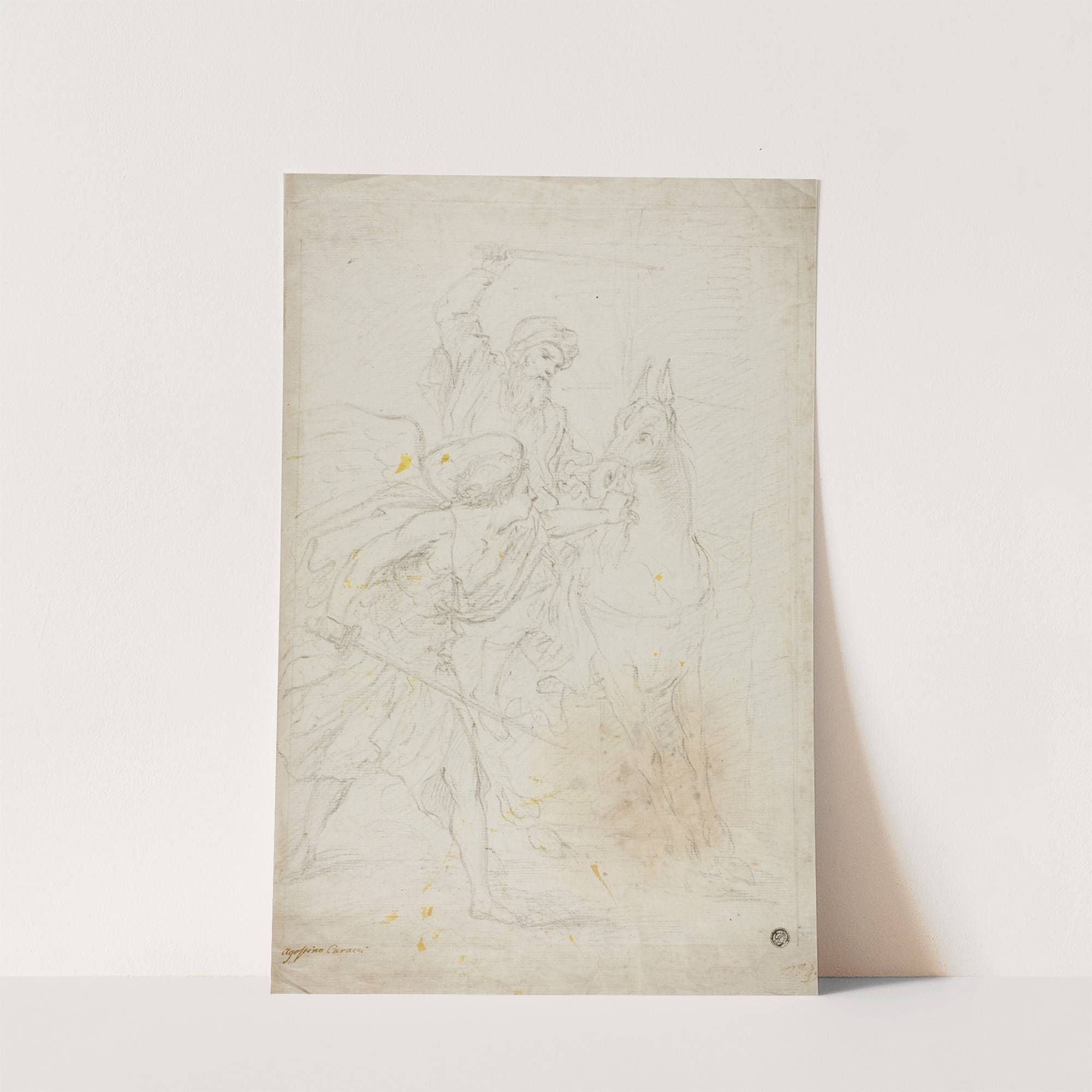 This is a delicate pencil sketch titled "Balaam's Ass" by Agostino Carracci, showcasing an intricate and detailed depiction of the biblical scene with minimalistic yet expressive lines. The drawing features a dynamic The main subject, Balaam?s ass, is prominently positioned...
