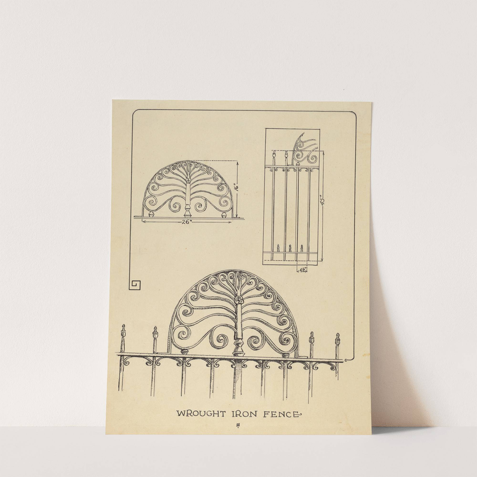 This elegant art print features intricate black line illustrations of wrought iron fence designs, meticulously drawn with a focus on detail and symmetry. The top section showcases two distinct patterns: the upper left segment displays an ornate archway design with...