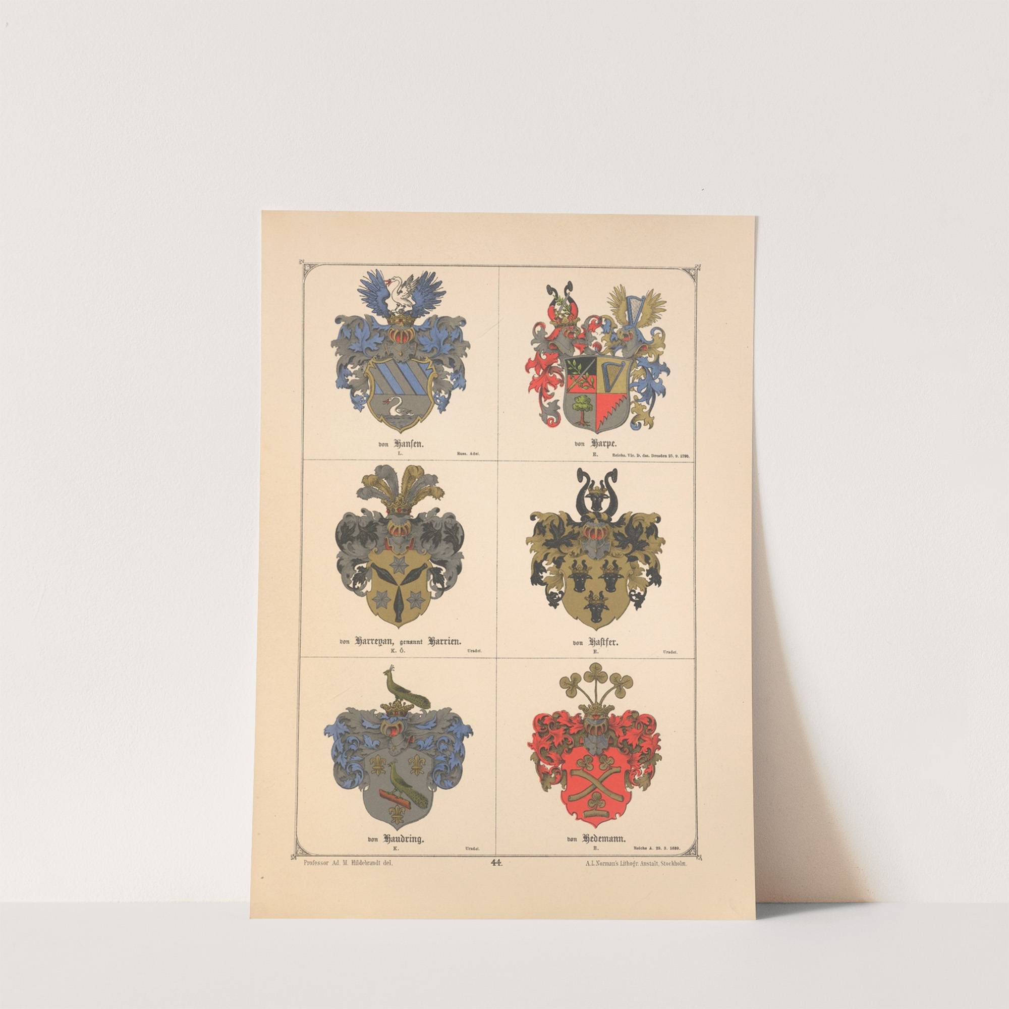 This artwork features six intricately detailed heraldic crests, each uniquely adorned with vibrant colors and symbolic elements. The top left crest showcases blue bird motifs and a striped shield, while the top right displays a fiery red lion surrounded by...