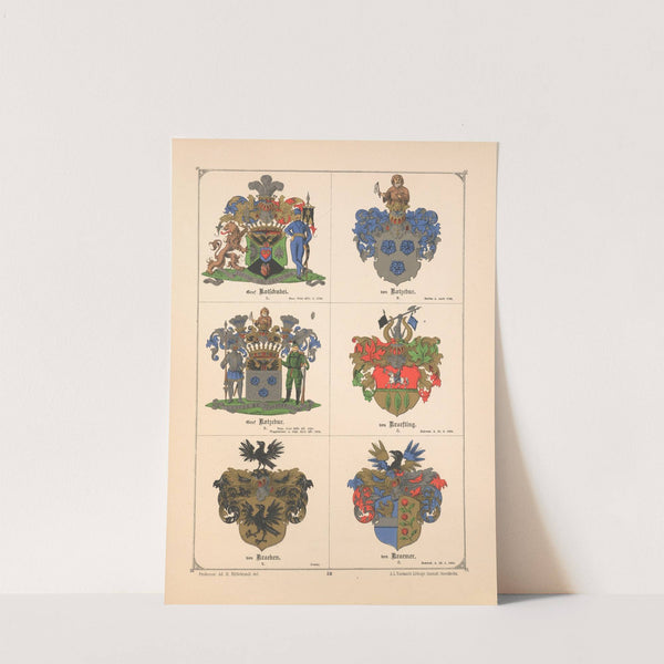 This beautifully illustrated print features six elaborate heraldic crests, each showcasing unique designs and rich colors. The top left crest depicts a medieval knight in vibrant reds and greens, accompanied by a lion, standing next to a shield adorned with...